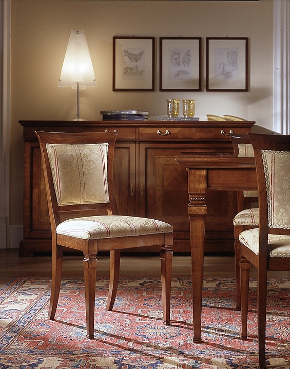 Les chaises et fauteuils Ca 'Dolfin sont en bois de cerisier avec la patte avant qui rappelle la même table de collection. Les tissus sont fabriqués en Italie et de haute qualité.