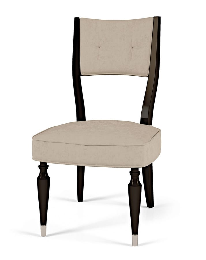 La chaise fait partie de la collection du Palais Royal. La doublure en tissu de haute qualité le rend élégant et raffiné, laissant la forme simple et linéaire inchangée. La structure est en finition laquée noire, et sur les pieds se trouvent les embouts chromés qui caractérisent cette collection. Autres revêtements disponibles.