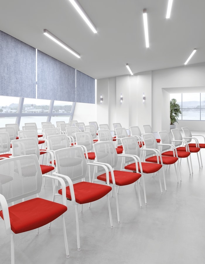 Série avec assise et dossier séparés. Modèles luges à 4 pieds ou empilables, avec ou sans accoudoirs, ou avec tablette écritoire, versions pivotantes ou sur poutre. Dossier taille XL.