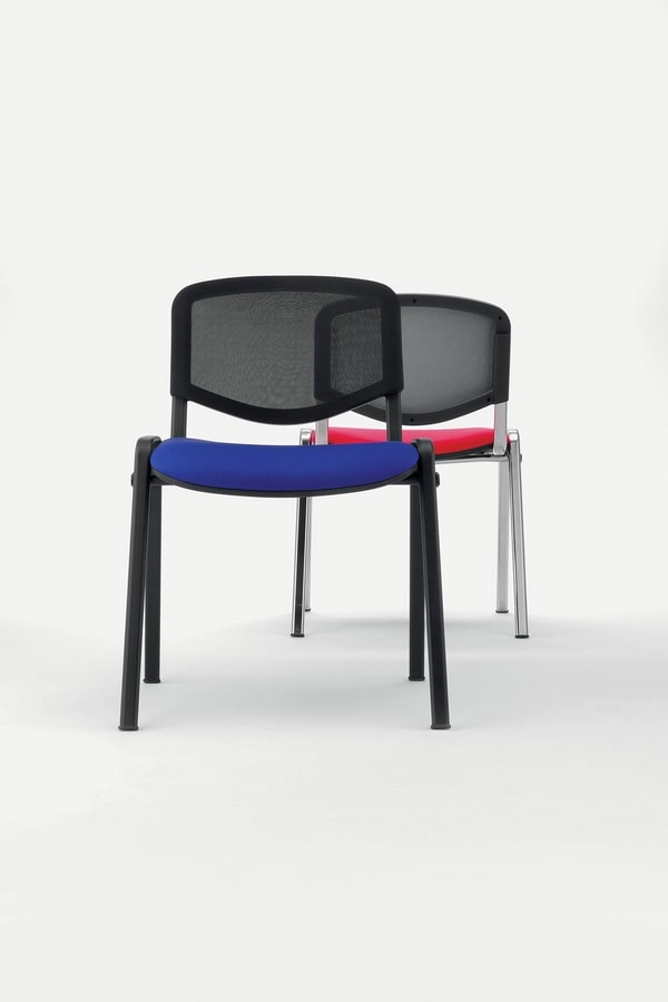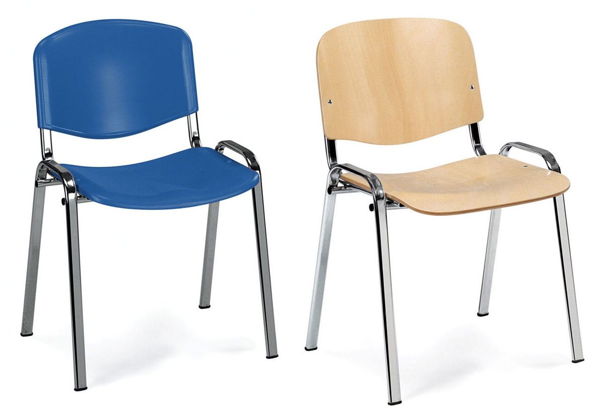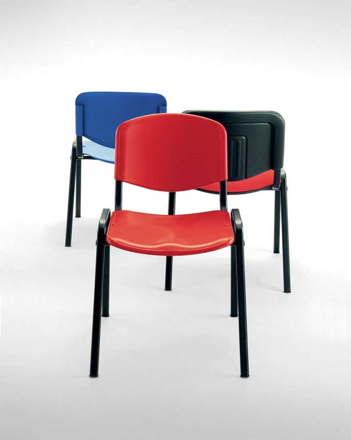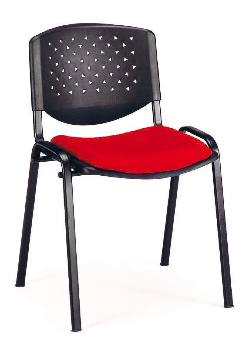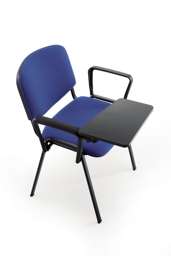 Président pour la conférence avec 4 jambes peintes en noir ou en chrome. Versions disponibles: bois verni, rembourré, en plastique ou en mesh. Egalement disponible avec tablette écritoire.