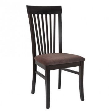 Chaise pour salle à manger, en bois de hêtre. Siège rembourré. Dossier avec lattes de bois verticales.