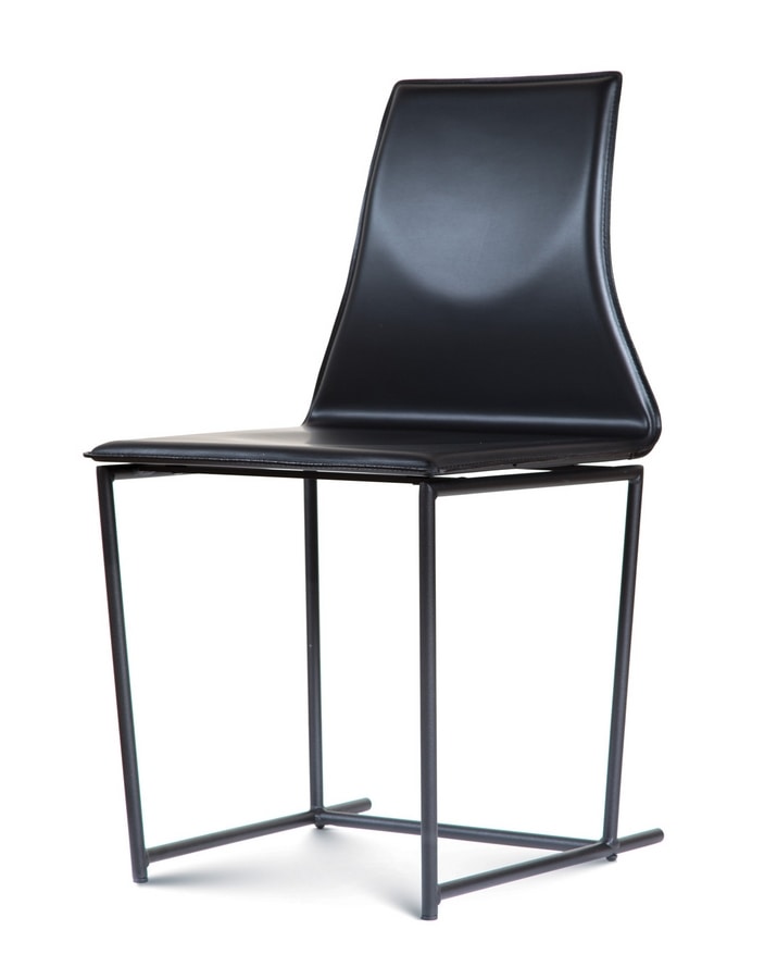 Demander prix Produits similairesChaise avec base en métal noir. La coque, recouverte de cuir, se caractérise par la ligne évasée du dossier.