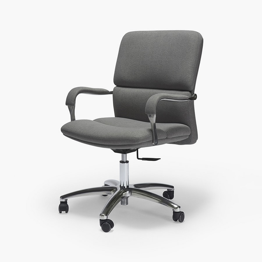 Demander prix Produits similairesFauteuil de direction en aluminium poli avec 5 rayons, assise et dossier rembourrés recouverts de similicuir noir, de cuir noir ou de tissu Nativa. Accoudoirs recouverts d'aluminium et mécanisme de pivotement avancé à 5 positions.