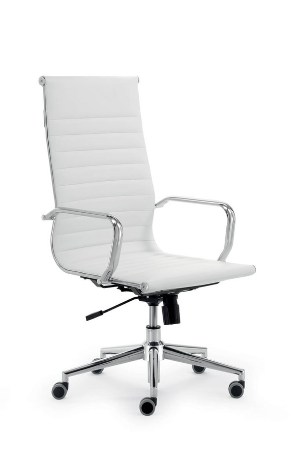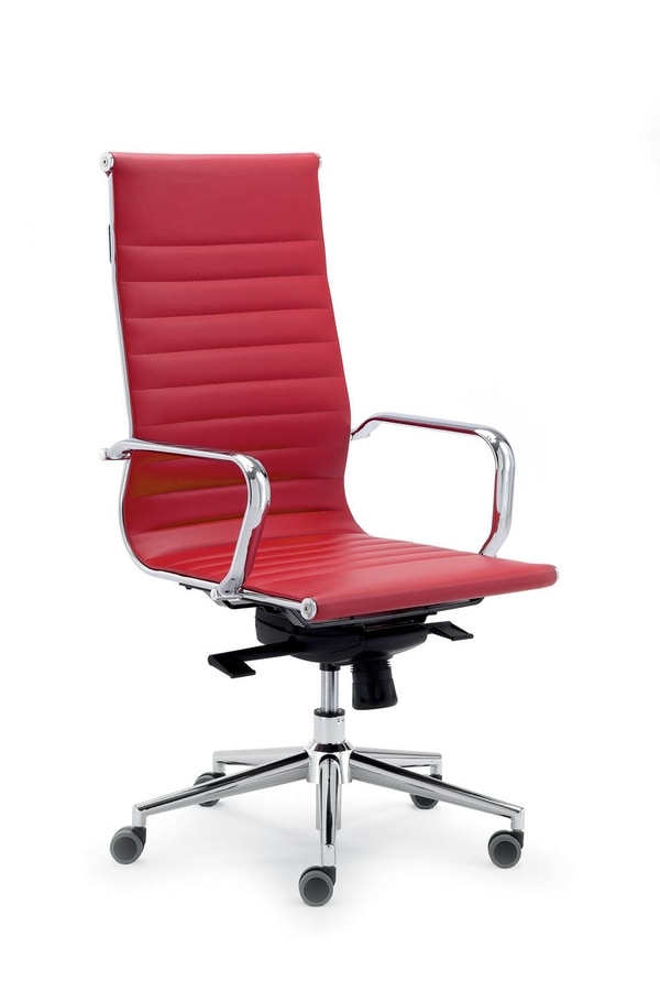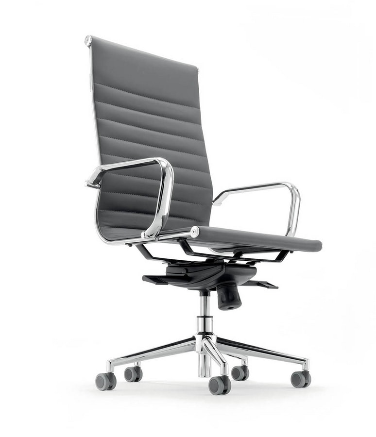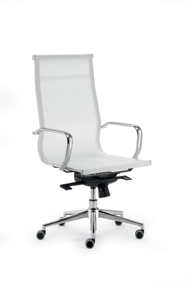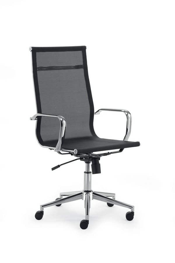 Chaise de bureau exécutif avec dossier haut. Disponible en version rembourrée ou en mesh. Accoudoirs et piètement à rayons métalliques.