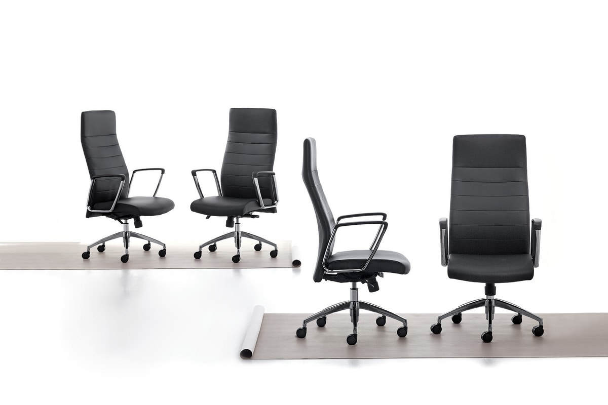 Fauteuil de direction, avec des proportions élancées et fines. Le revêtement à bandes horizontales et l’anneau fixe de l’accoudoir le rendent élégant et moderne.