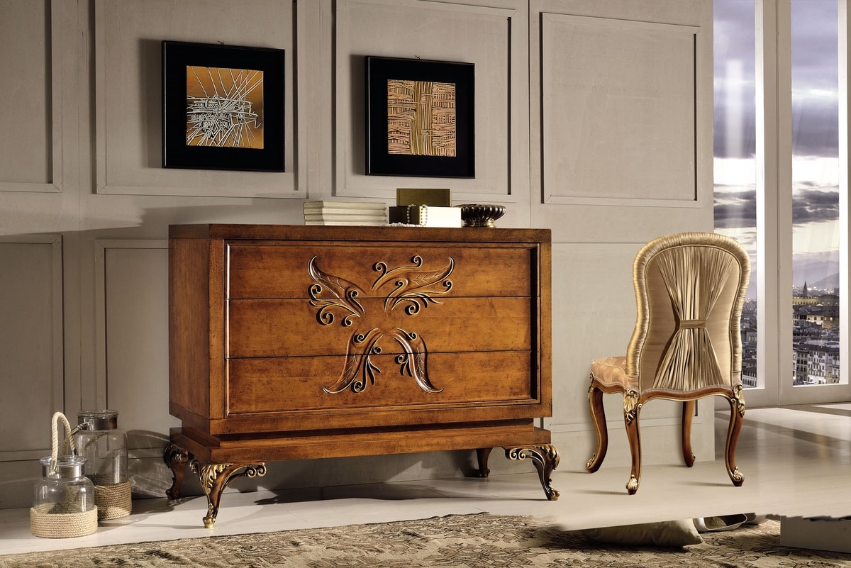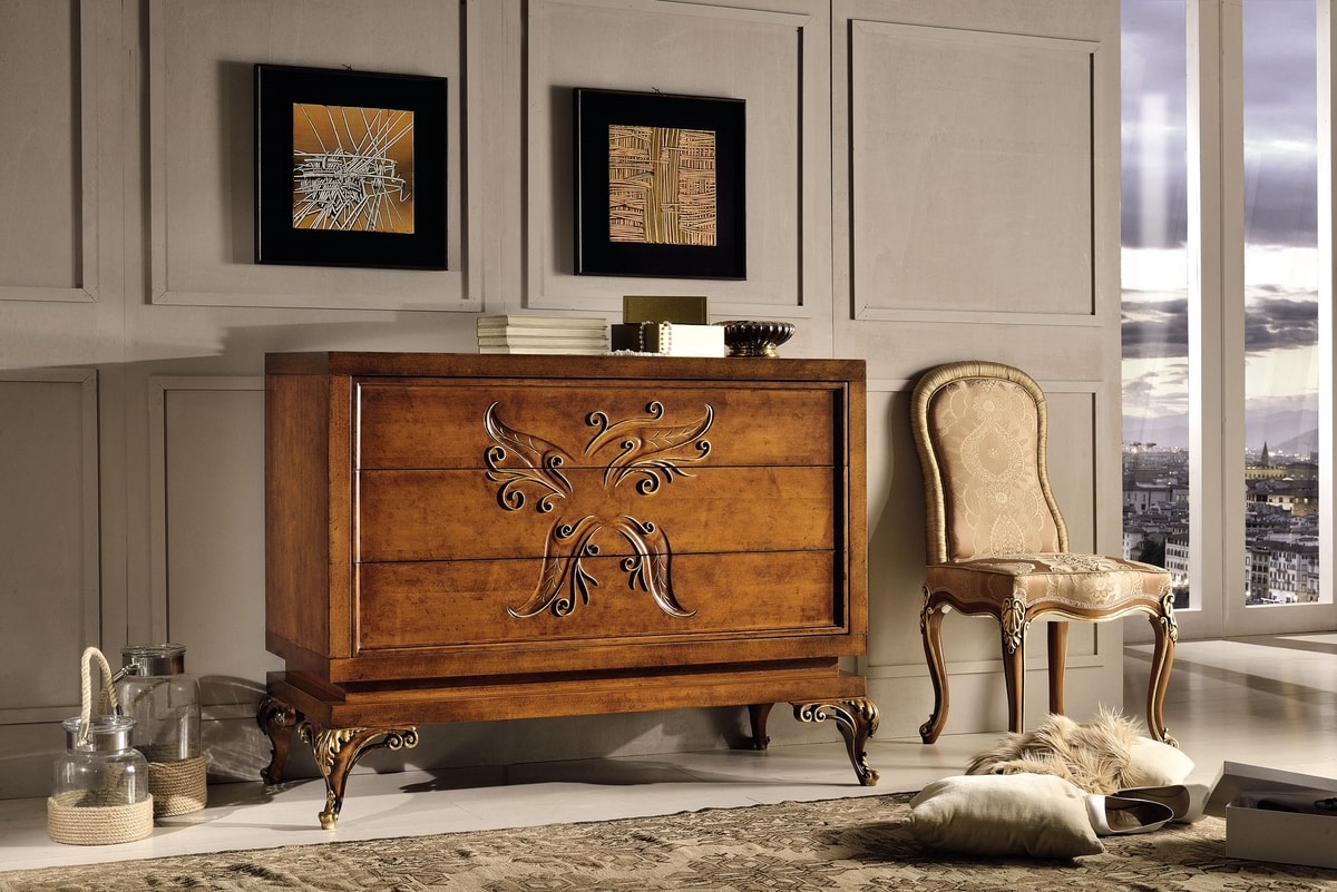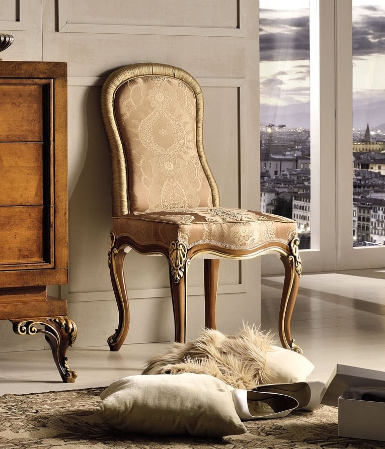 Chaise en bois, style classique, avec sculptures décoratives raffinées. Assis et dos avec un couverture de tissu floral.