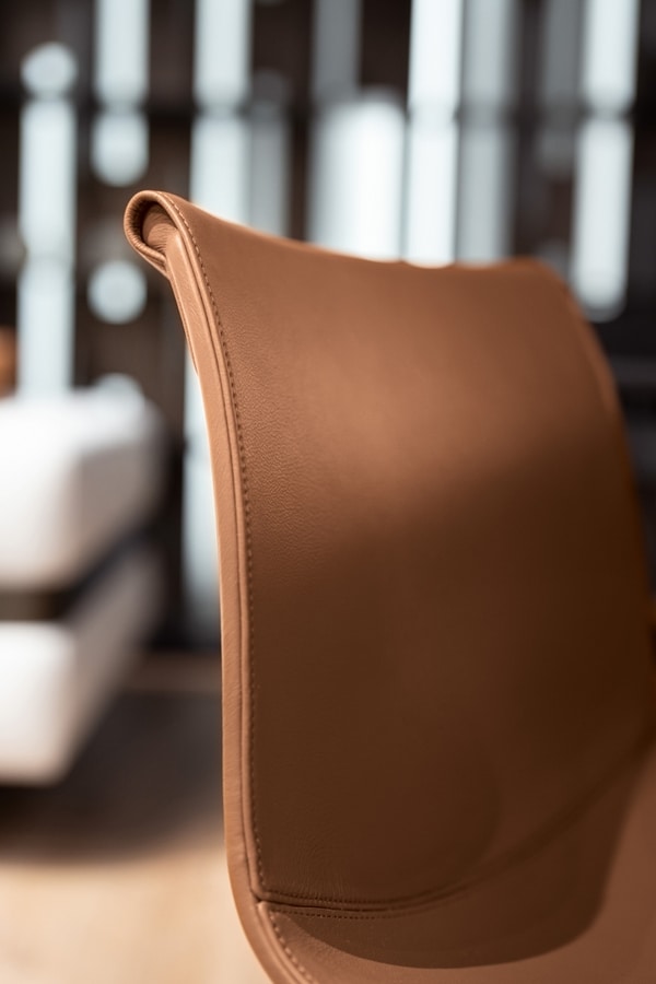 Chaque élément, des coutures au rembourrage, reflète l'excellence du travail du cuir traditionnel. Le revêtement en cuir, fini dans un ton cognac chaleureux, s'associe avec élégance à la structure en métal spécialement sélectionnée, créant un contraste raffiné entre la chaleur de la matière et la fraîcheur de son support. Ses lignes sont rehaussées par la synthèse parfaite de tradition et de modernité, où chaque élément raconte une histoire de maîtrise authentique.