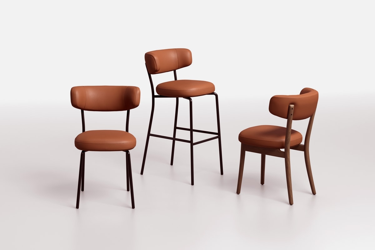 La collection Bold Soul comprend une chaise de salle à manger avec assise et dossier rembourrés, disponible avec une structure en métal ou en frêne massif. Une version tabouret avec structure en métal est également proposée.