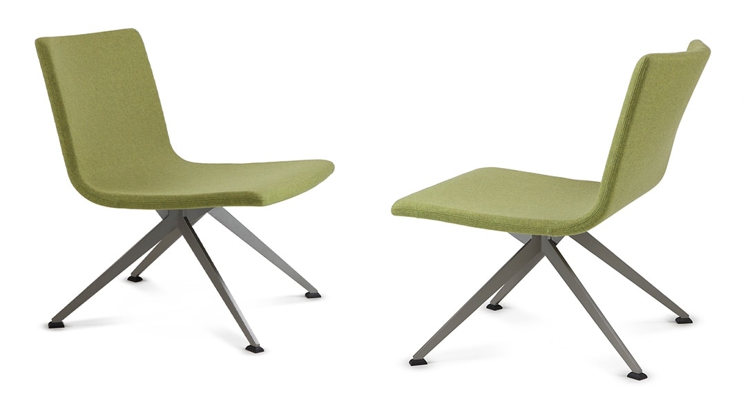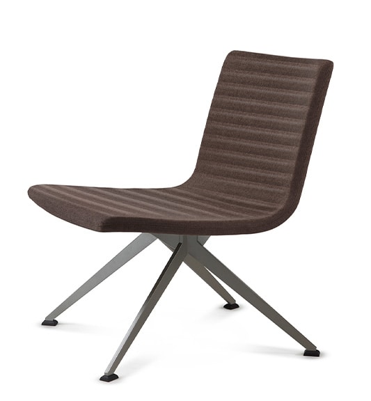 Chaises avec coque en contreplaqué de hêtre naturel ou avec contre-corps avant rembourré et recouvert ou entièrement rembourré et recouvert. Structures 4 étoiles en aluminium brossé et poli ou sur socle en métal peint ou chromé, toutes rotatives avec retour automatique. Versions à 4 pieds en métal peint.