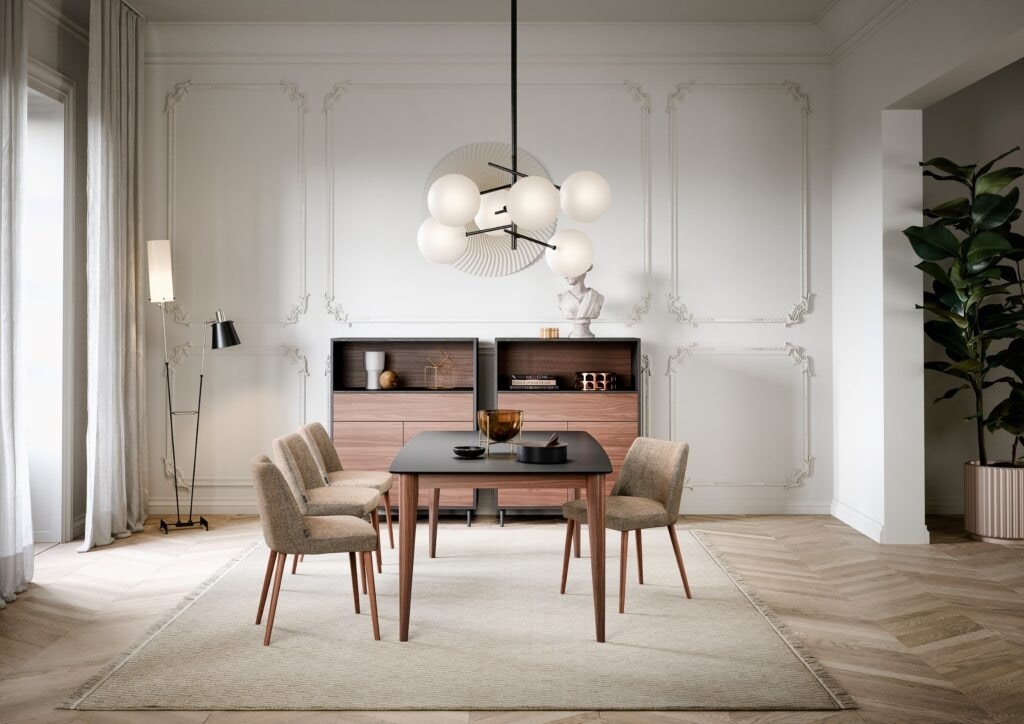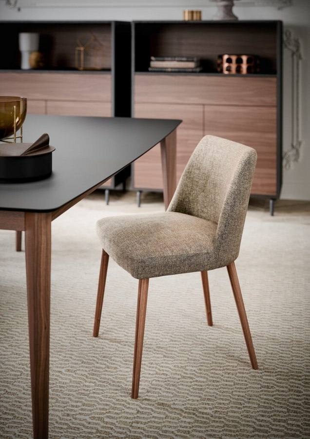 La chaise Fenice est caractérisée par une assise et un dossier rembourrés.