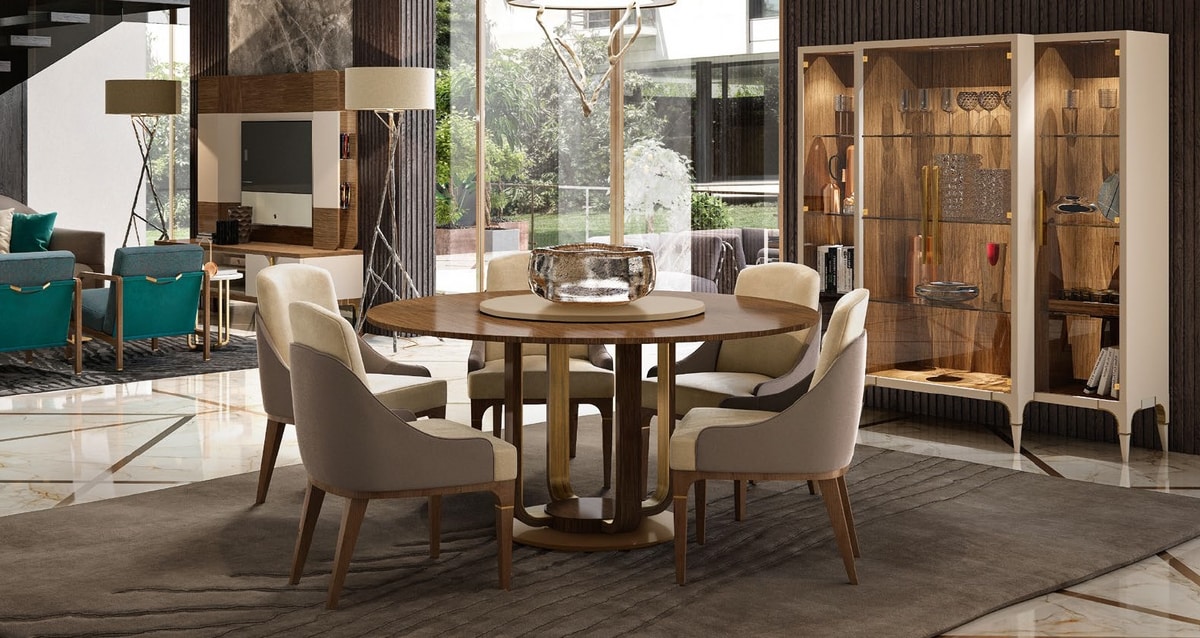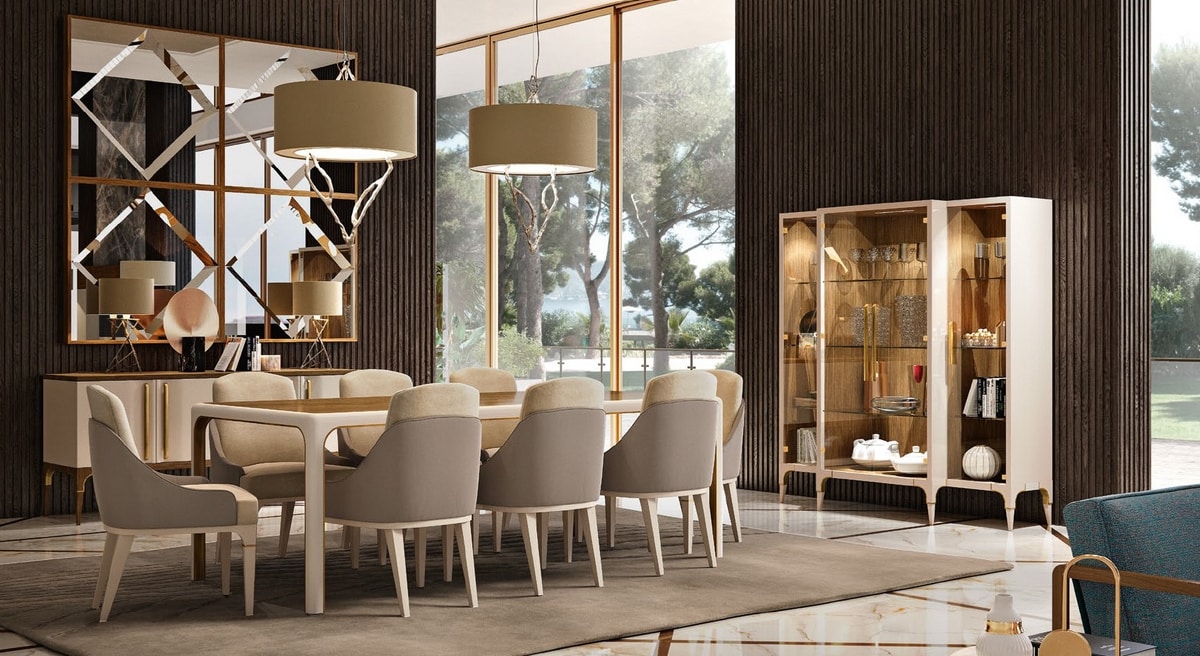 L'espace de vie se révèle lumineux et accueillant, qualités précieuses qui naissent des combinaisons réussies de l'essence de noyer, des laques claires, des métaux dorés et des tissus aux tons assortis. C'est une invitation quotidienne à la sérénité et à la détente, dans leur forme la plus recherchée.