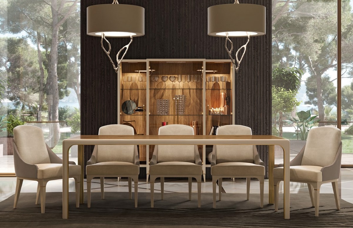 Art et beauté intemporelle. La collection Firenze naît d'une inspiration qui s'exprime avec des formes douces et élégantes combinées à des détails métalliques et du bois précieux, tous les éléments participent à un savant jeu de combinaisons de différents matériaux - résultat de la plus haute tradition du meuble italien.