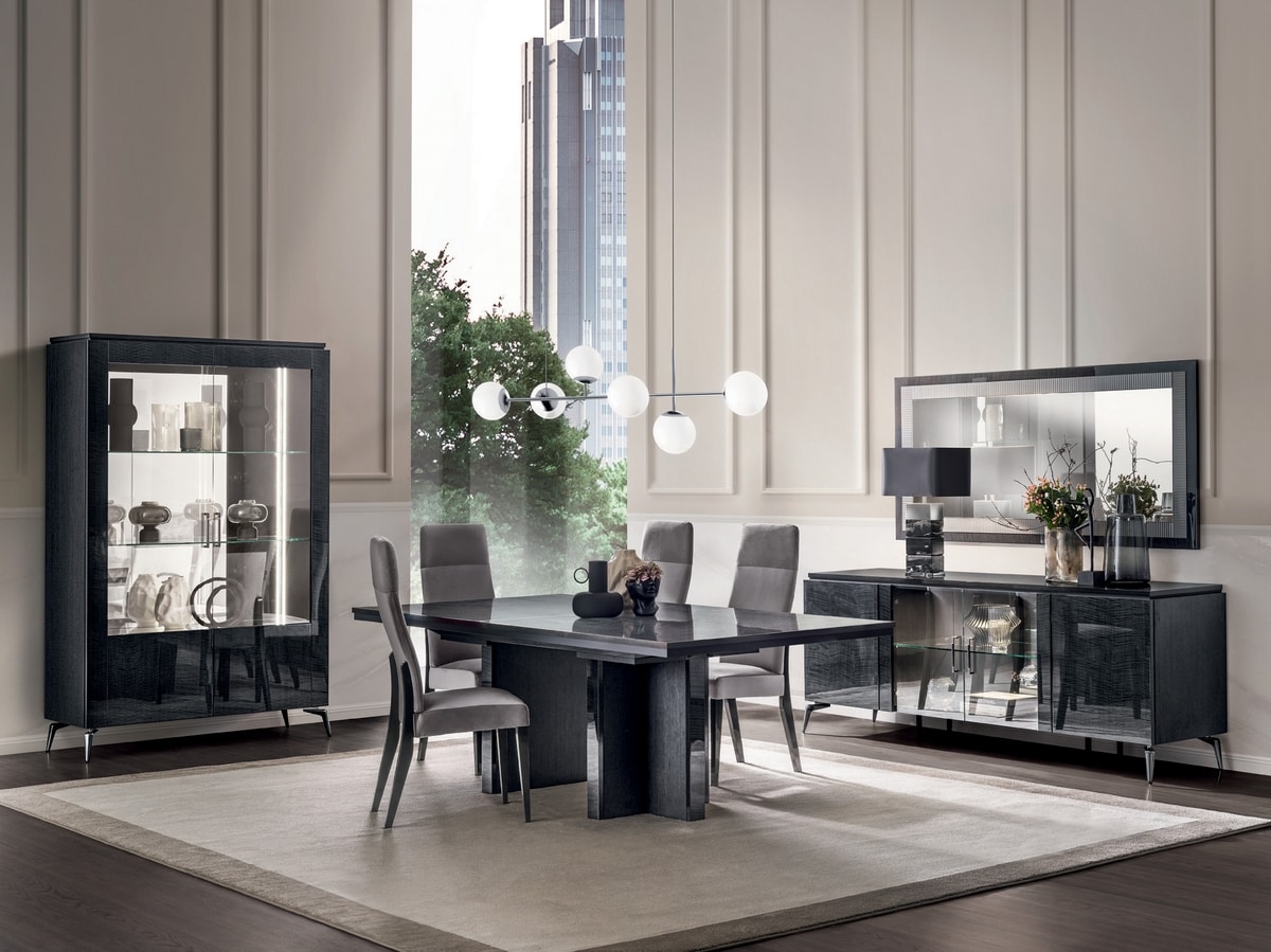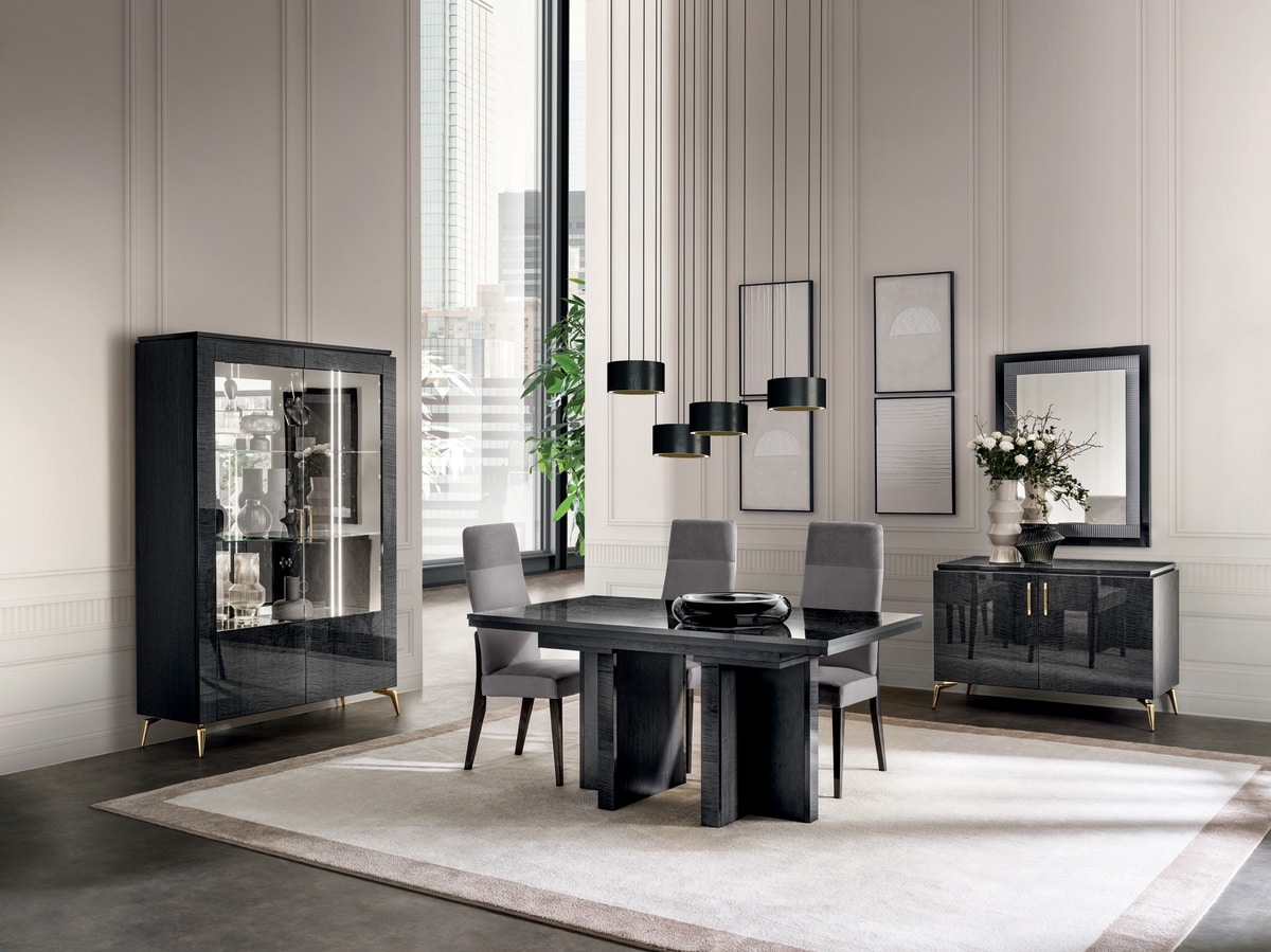 Demander prix Produits similairesEsthétique propre et raffinée qui reflète l'essence du style contemporain. Le design minimal et les formes soignées correspondent parfaitement aux matériaux précieux et aux finitions pour habiller les salons et les restaurants avec une élégance naturelle. Une finition sophistiquée en bois de sycamore brillant gris fumé est le fil Rouge qui relie tous les éléments de la collection Meridiana: tables, vitraines, buffets et compléments comme la console et des tables occasionnelles. La possibilité de choisir entre deux types de finition différents pour les pieds et les poignées vous permet de créer différentes combinaisons avec une conception exclusive. La finition Chrome noire incarne l'élégance et la sobriété de ton-sur-ton, tandis que la finition en or brillant est le détail qui ne passe pas inaperçu, comme une déclaration de style immédiat. Le miroir est orné de verre gris à effet de flûte, tandis que les lumières LED créent des regards inattendus dans les vitrines et les buffets. Chaque petit détail reflète l'intention de la collection Meridiana: exprimer l'essence du luxe contemporain. Une simplicité chic et raffinée pour les salles de restauration et de vie.