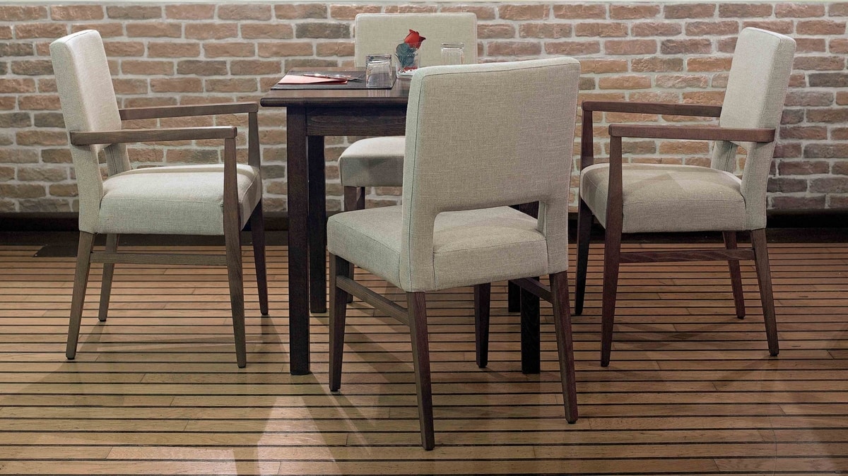 Chaise classique en bois de bec avec assise et dossier rembourrés. Idéal pour le contrat et le marché résidentiel.