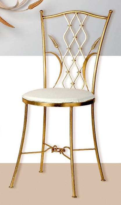 Chaise en fer forgé avec finition feuille d'or; assise rembourrée et dossier perforé.