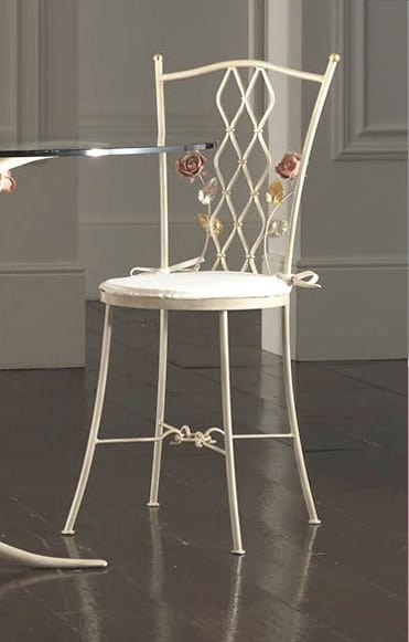 Chaise en fer forgé travaillé et décoré à la main, avec assise rembourrée et dossier perforé.