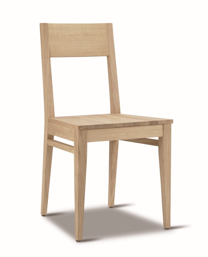 Chaise en bois de chêne avec siège en bois massif, adapté aux environnements contractuels et résidentiels. Également disponible avec un siège rembourré.