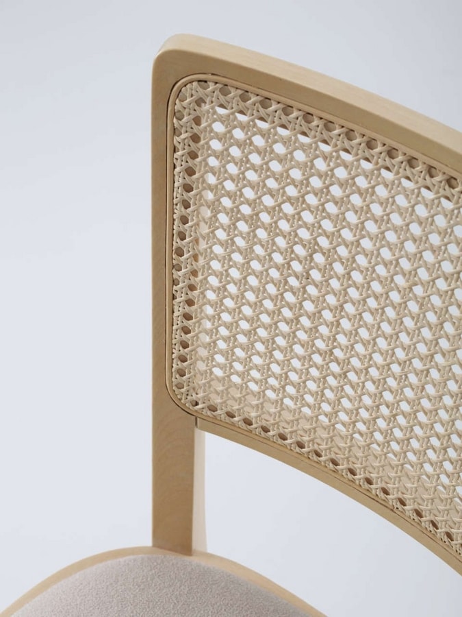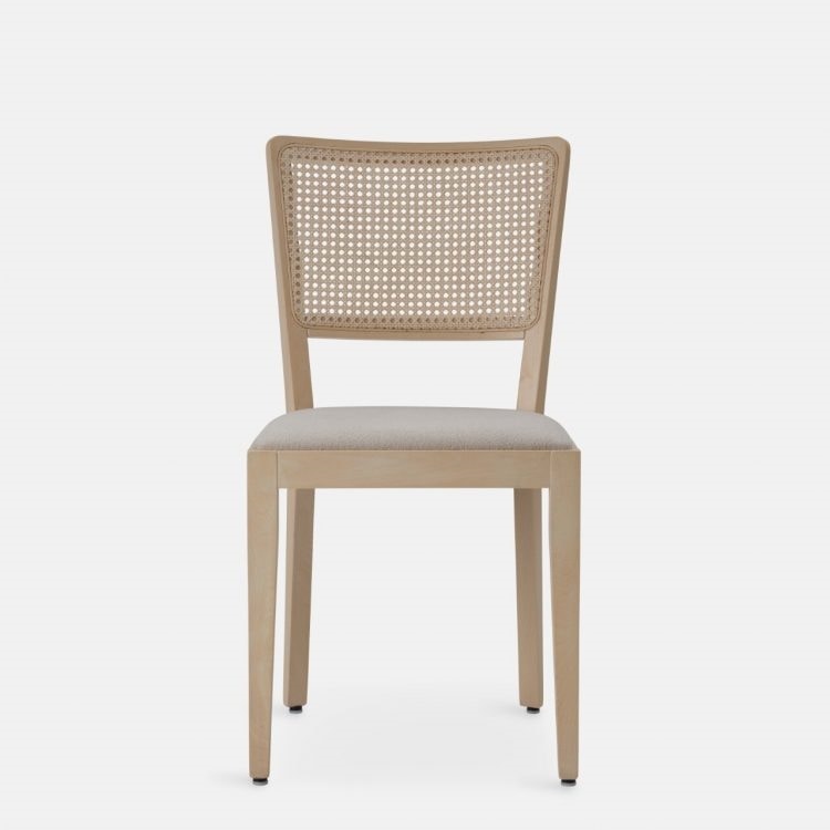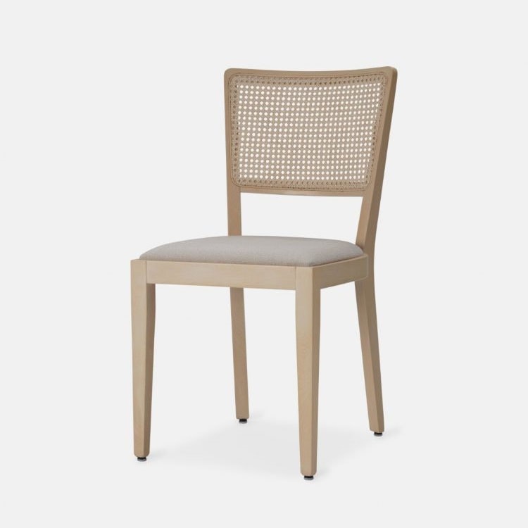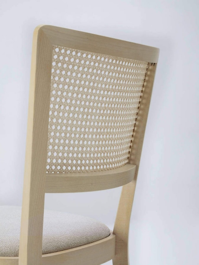 Ristora possède une structure en bois de hêtre massif disponible dans nos teintes standards ou dans des finitions personnalisées. L'assise et le dossier en mousses ignifuges sont recouverts de notre sélection de tissus ou personnalisés dans le tissu du client. Le dossier est également disponible en cannage.
