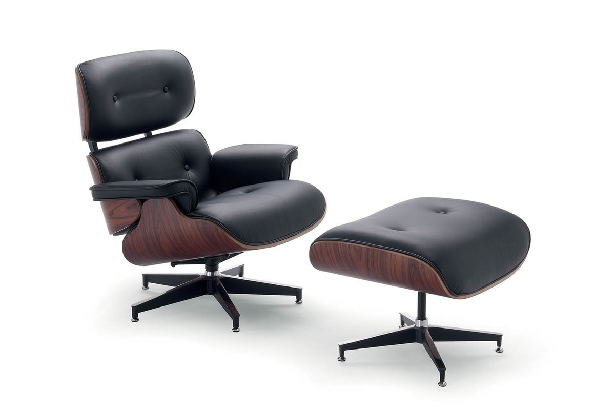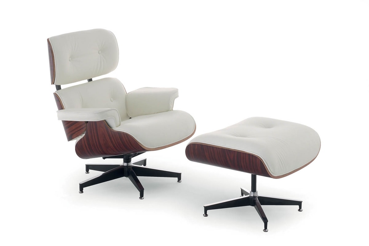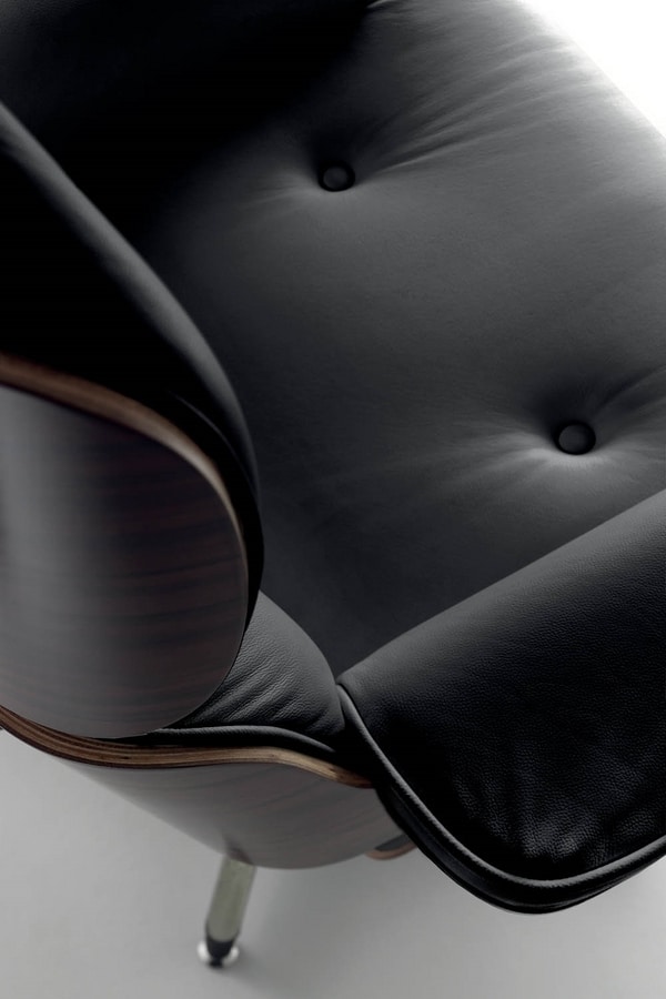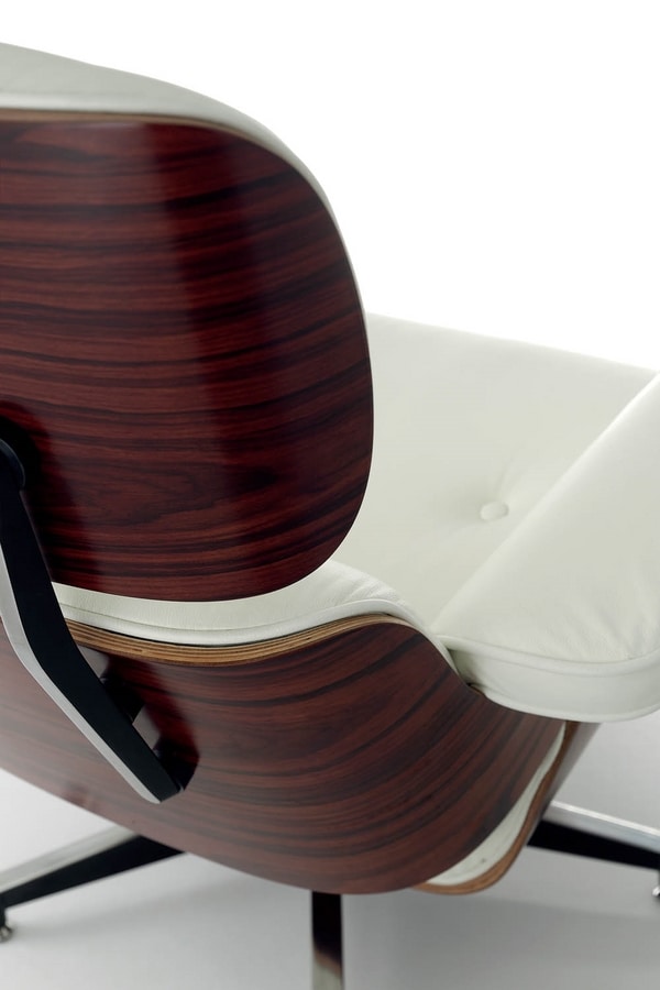 Chaise longue avec pouf. Coque en hêtre, rembourrée en cuir noir ou blanc. Base en aluminium poli avec patins en polypropylène. Colonne pivotante et plaque fixe en aluminium peint en noir. Structure en contreplaqué - Palissandre peint. Mousse de polyurethane.