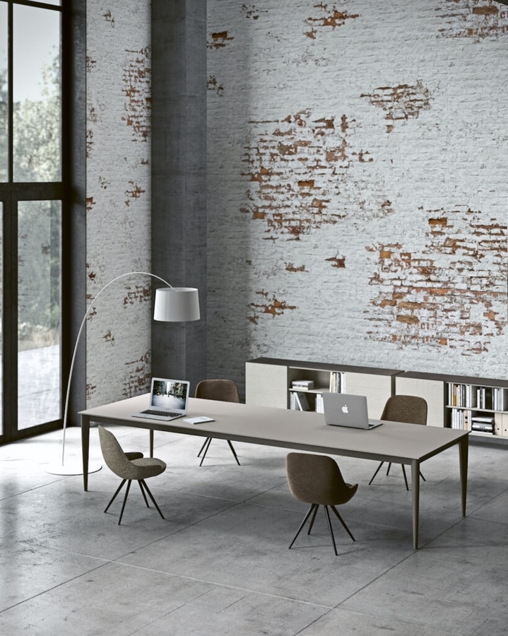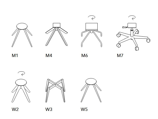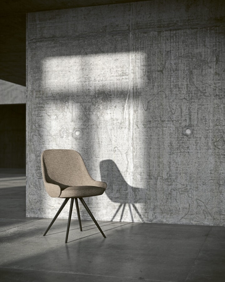 Chaise avec rembourrage en polyuréthane expansé ; sept bases différentes sont disponibles, dont trois pivotant, en métal verni ou en bois en différentes finitions.