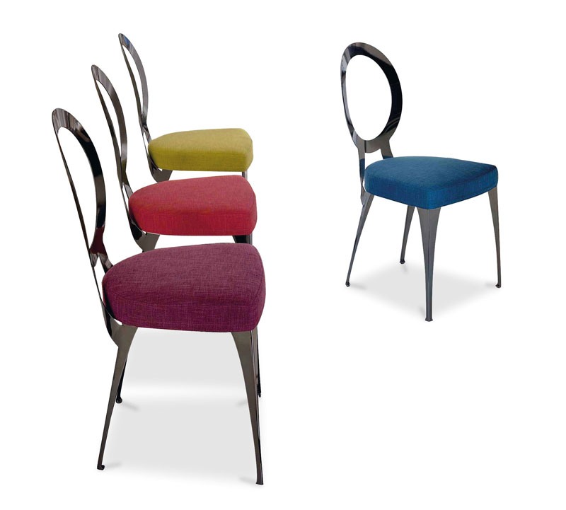 Chaise avec découpe laser à semi-fer cadre, la main-courbé, la main-frotté et poli à la main. Bain de fusion et de traitement en continu des soudures d'alimentation du fil. En forme de siège en bois, caoutchouc mousse de rembourrage et revêtement en tissu ou en cuir (amovible). Finition bain de galvanisation, l'épaisseur minimum de 25 microns.
