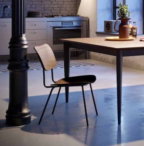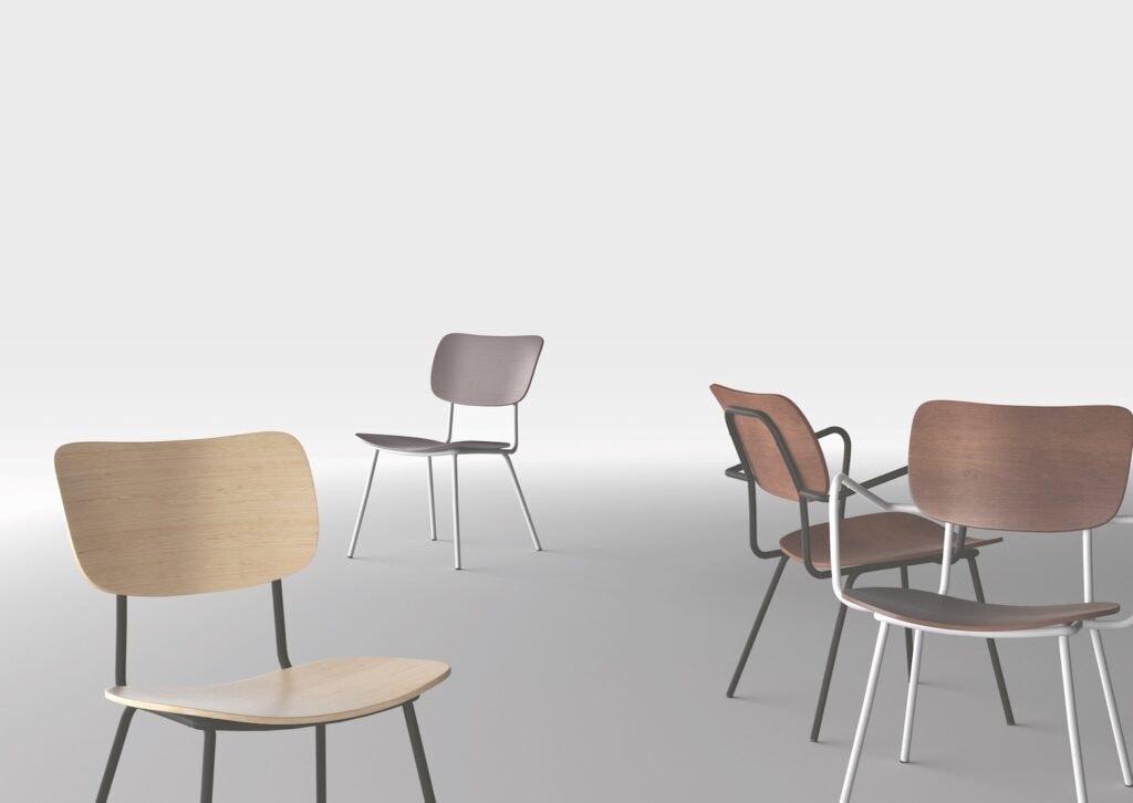 Suggestions vintage avec Retrò, chaise et fauteuil avec structure en métal verni mat et assise en bois de noyer national ou chêne-rouvre.