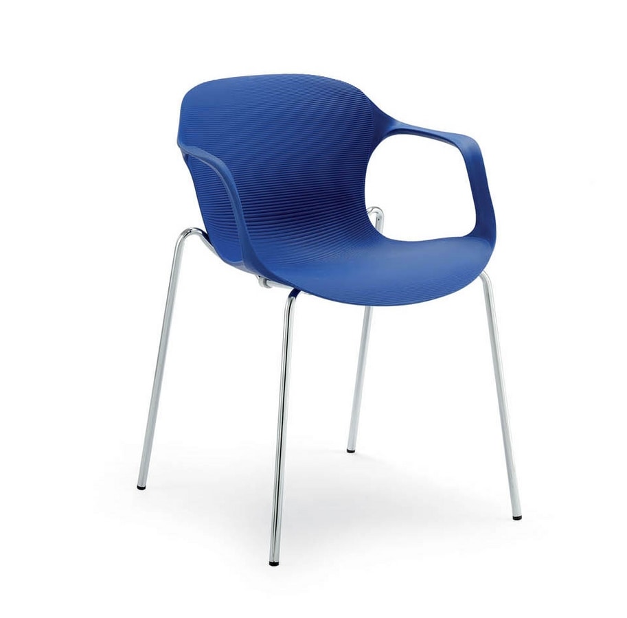 Chaise empilable avec coque en plastique. Avec accoudoirs intégrés. Base avec 4 pieds en métal. Différentes couleurs disponibles.