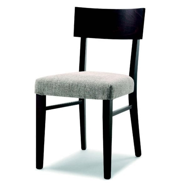 Chaise en bois de hêtre teinté. Siège rembourré et recouvert de tissu. Aussi disponible avec siège en bois. Un produit adapté à la salle à manger ou aux restaurants.