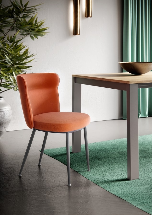 Chaise avec structure en métal laqué, recouverte de tissu ou de velours de différentes couleurs.