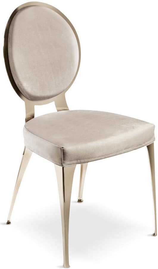 Chaise rembourrée moderne avec cadre en acier et dossier nu. Le cadre en tôle d'acier découpé au laser est incurvé, brossé et poli à la main et comporte des soudures d'alimentation en fil et des soudures TIG. La finition électrolytique de la base est disponible en gols, laiton, bronze, nikel noir, cuivre ou fer avec finition métallique. Le siège, en bois rembourré en mousse, est recouvert de tissu, de cuir ou de tissu fourni par le client. La tapisserie d'ameublement est démontable. Un style simple et propre pour une réinterprétation moderne d'un objet classique.