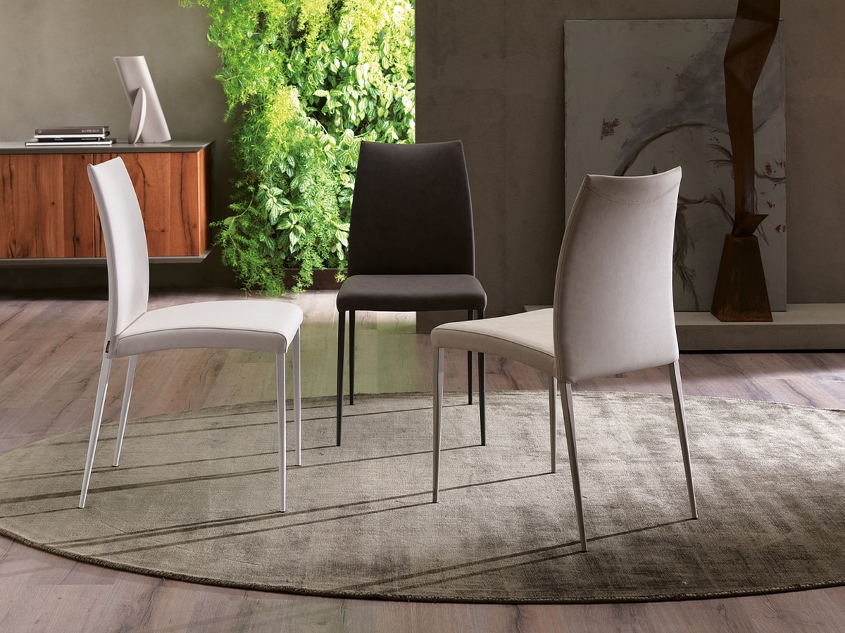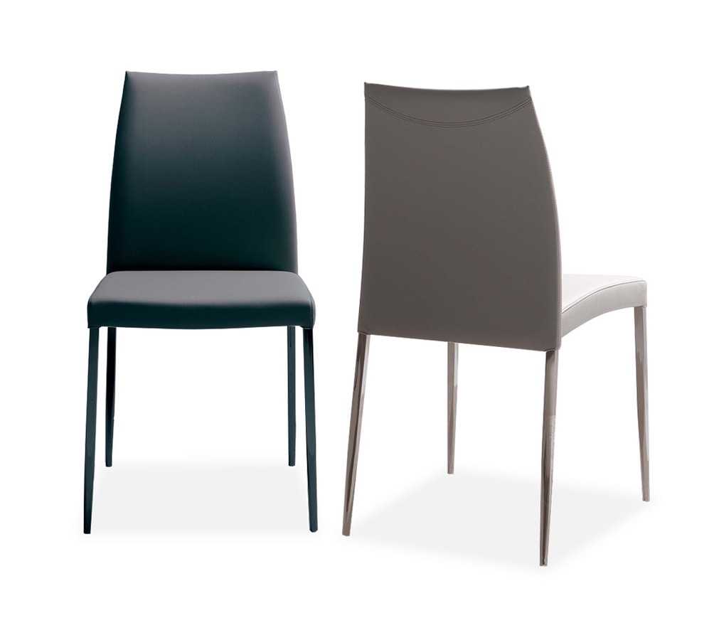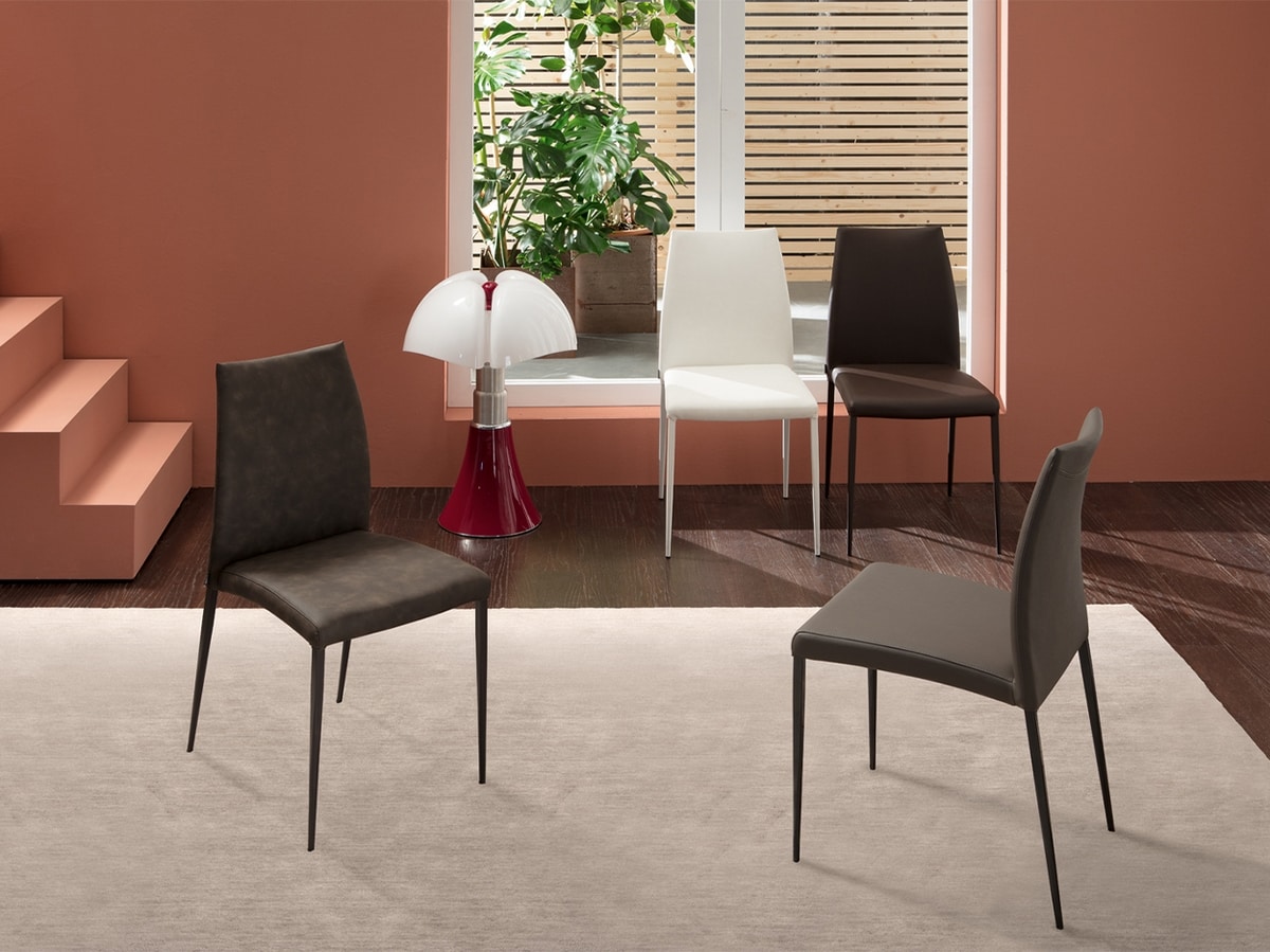 Nilo est une chaise entièrement recouverte de simili cuir au design moderne, confortable et élégant. La structure est composée de 4 pieds en métal de section ronde peints en blanc, graphite, café crème et moka, assortis à la teinte de l'assise pour un effet global harmonieux. Nilo est une chaise capable de meubler parfaitement la salle à manger ou les espaces de vie, en alliant praticité et design.