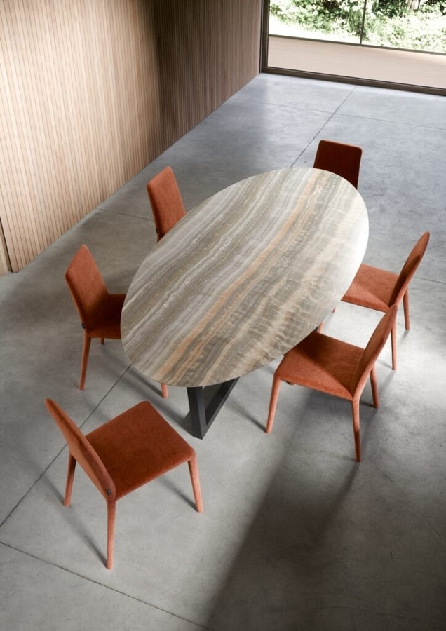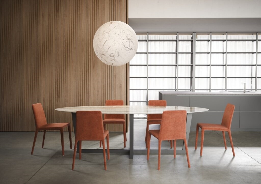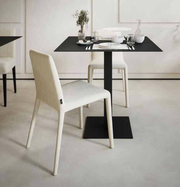 Chaise avec coque en polyuréthane flexible, avec pieds en mousse et insert en métal. Housse entièrement déhoussable.