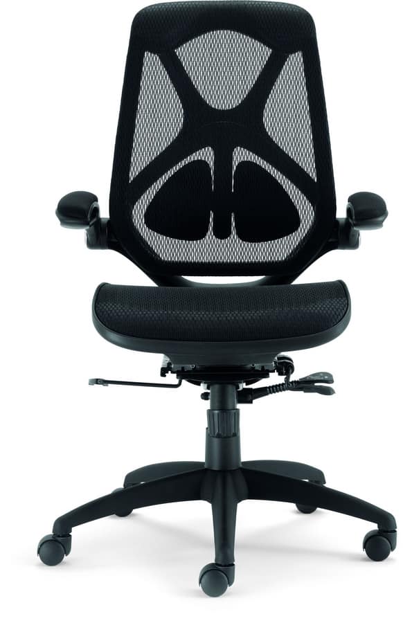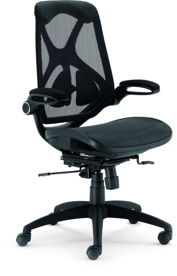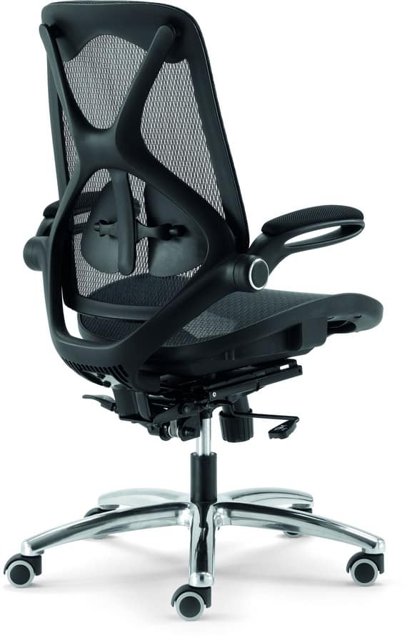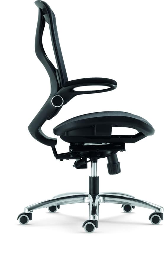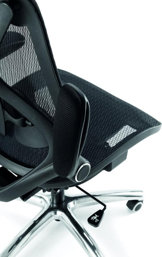 Chaise de bureau à dossier avec dossier en maille. Accoudoirs rembourrés et réglables. Base chromée ou noire avec des roulettes. Réglable en hauteur par mécanisme de gaz. Support lombaire. Siège recouvert de tissu technique.