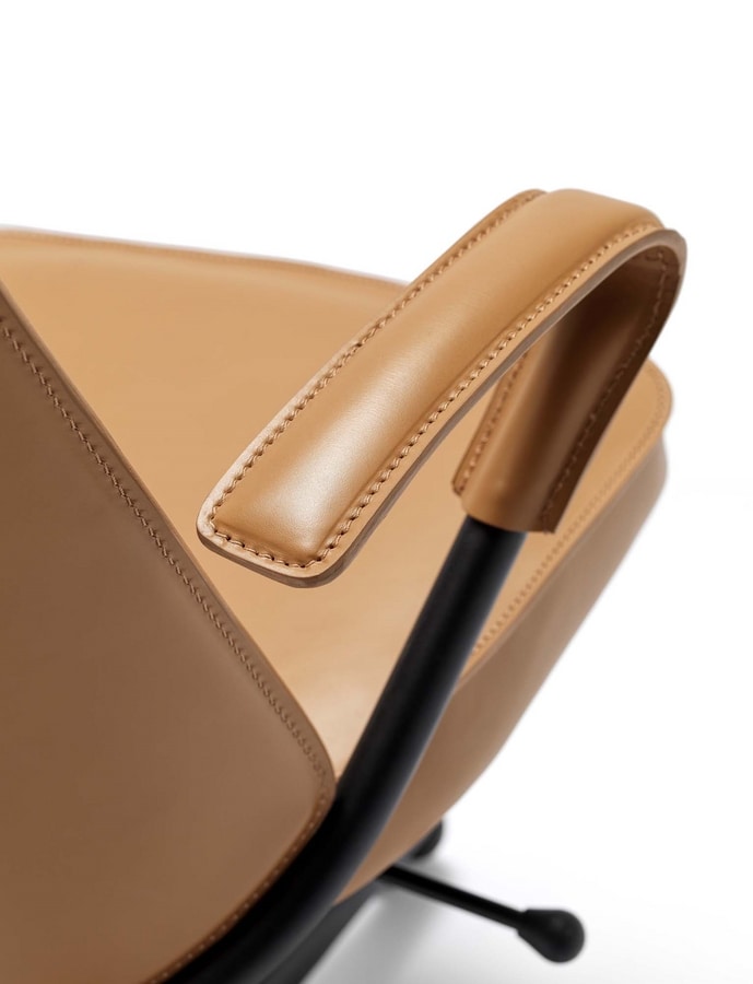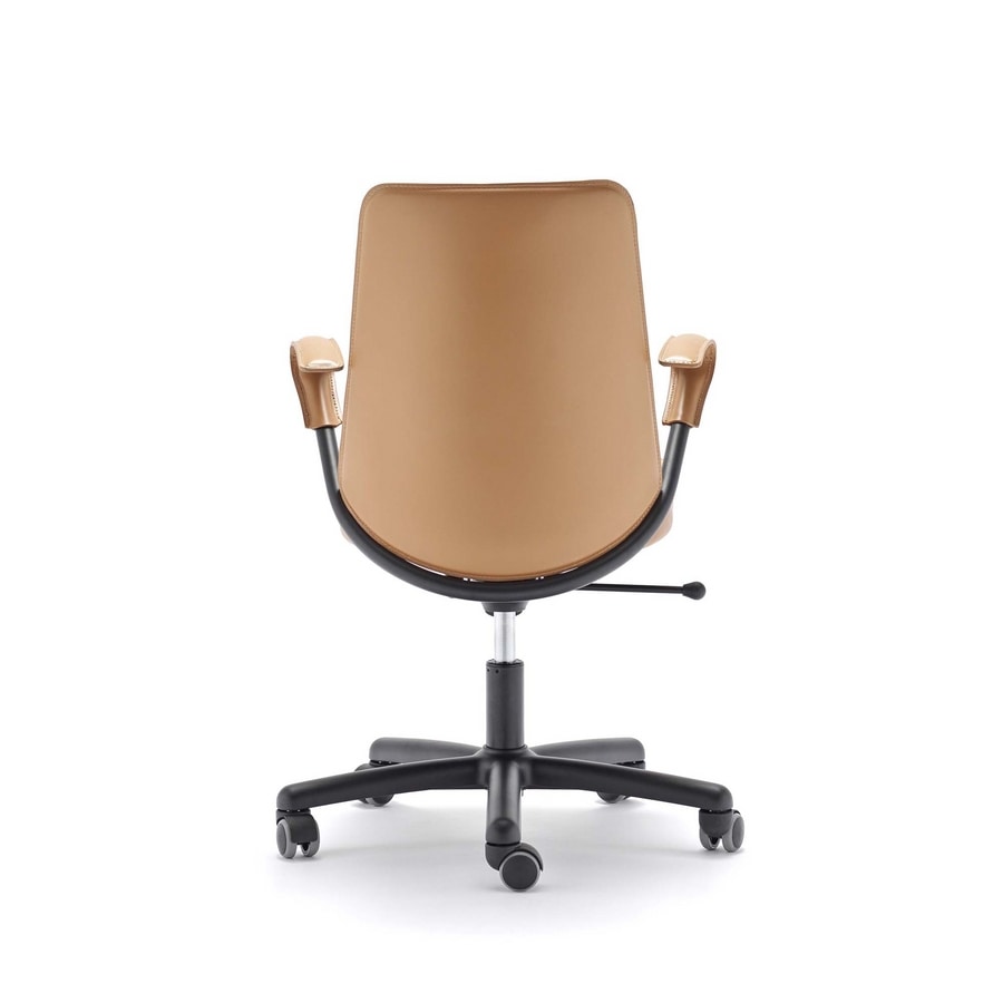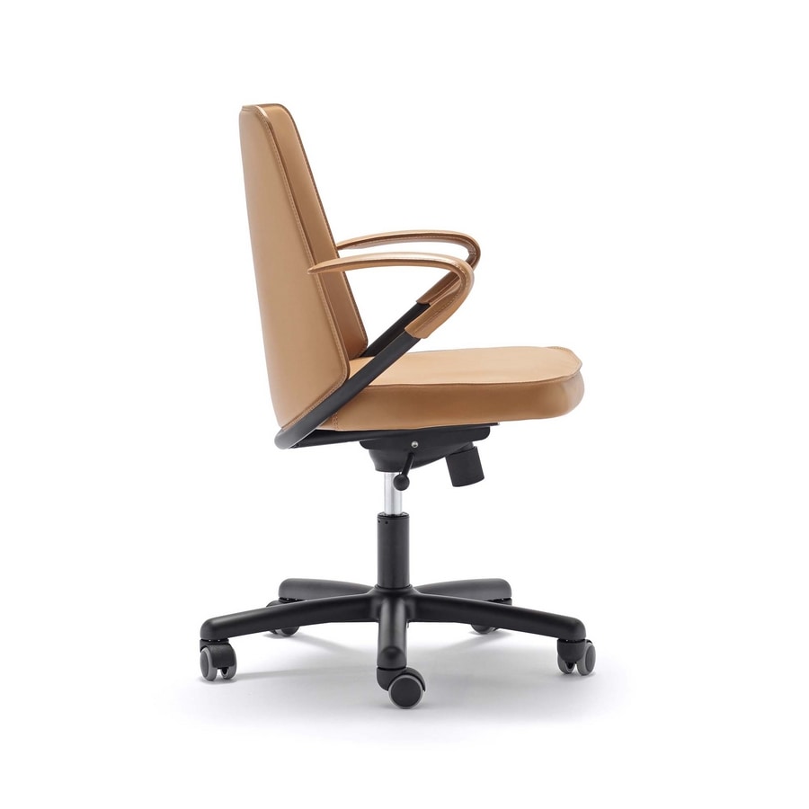 Fauteuil de bureau pivotant avec coque inclinable. Sa taille compacte le rend présent mais discret. Le dossier incurvé et les accoudoirs recouverts de cuir créent une silhouette jeune et informelle.