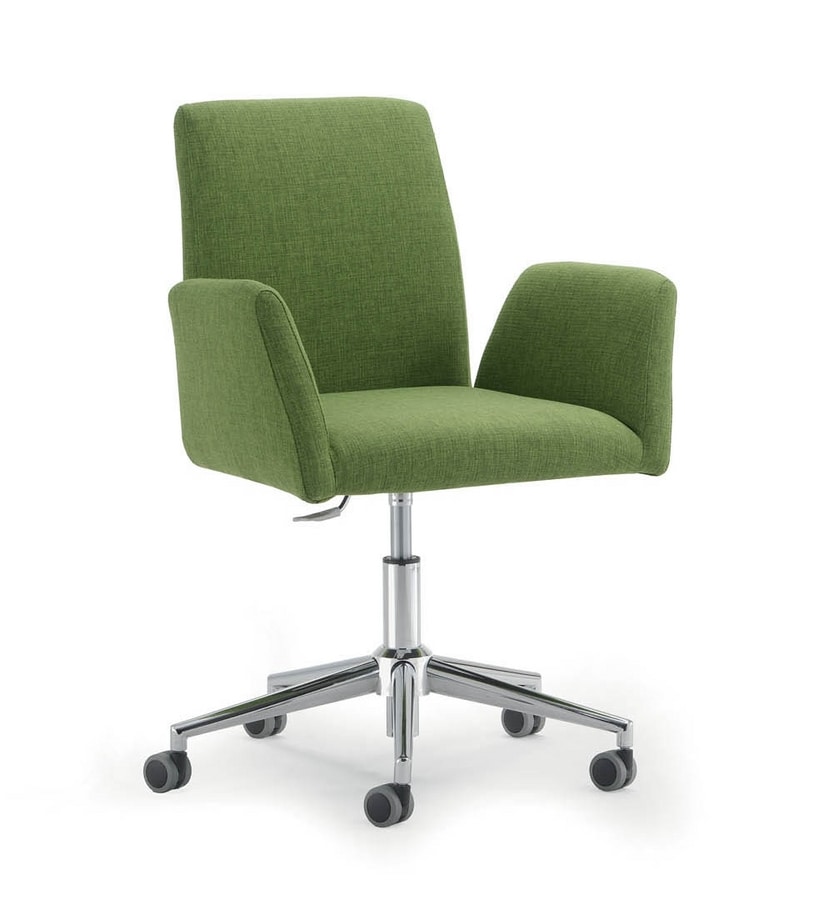 Chaise rembourrée avec base en métal avec roues en caoutchouc et dossier incurvé. Il est équipé d'un mécanisme d'inclinaison. Disponible en différentes couleurs. Chaise confortable et légère pour la maison et le bureau, fabriquée en Italie.