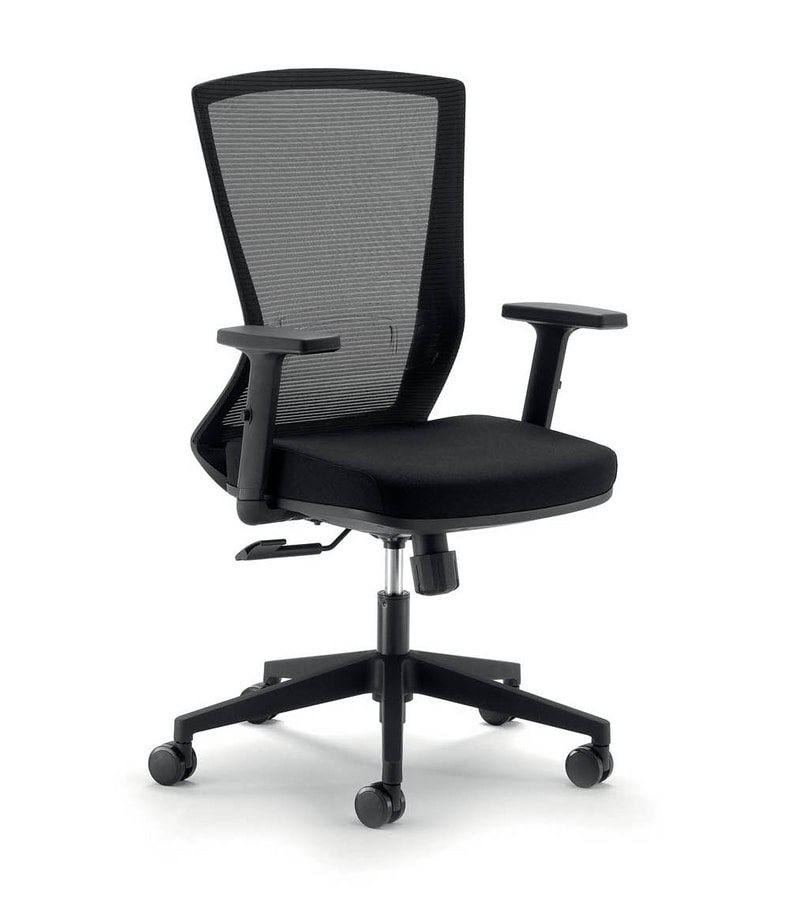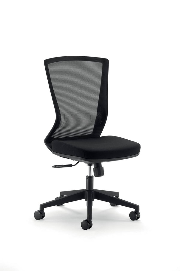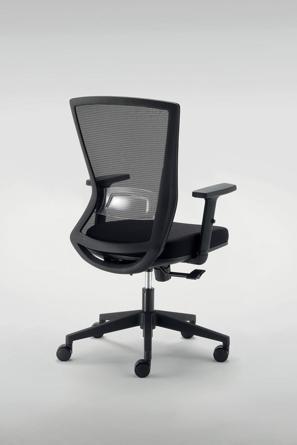 Chaise de bureau de travail. Roulettes souples standard d.60. Base en nylon pyramidal d.680. Ascenseur à gaz noir. Mécanisme synchro multibloc avec contrôle de tension et «antishock». Assise intérieure en contreplaqué avec mousse moulée épaisseur 6,00 cm densité 50 kg / m³. Revêtement en tissu noir. Housse de siège en polypropylène noir. Structure arrière en nylon renforcé. Revêtement transpirant en maille noire. Support lombaire réglable.