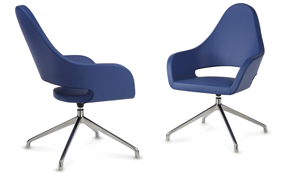Chaises monocoques dans la version avec ouverture centrale et accoudoirs intégrés, structures métalliques entièrement rembourrées et revêtues, disponibles en deux hauteurs.
