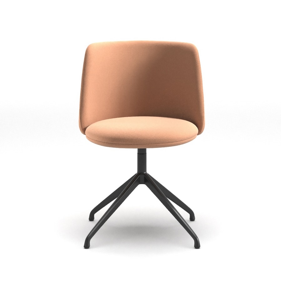 Fauteuil pivotant avec base à 4 branches en aluminium poli ou peint, assise et dossier en contreplaqué de hêtre avec rembourrage en mousse ignifuge et revêtement.