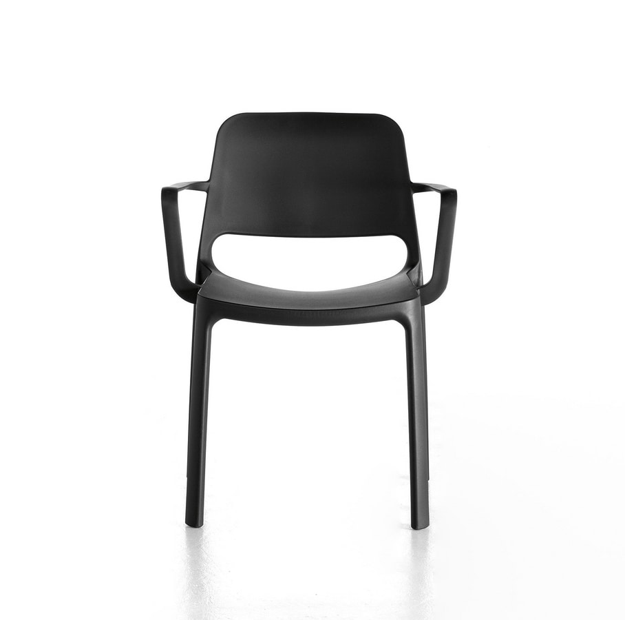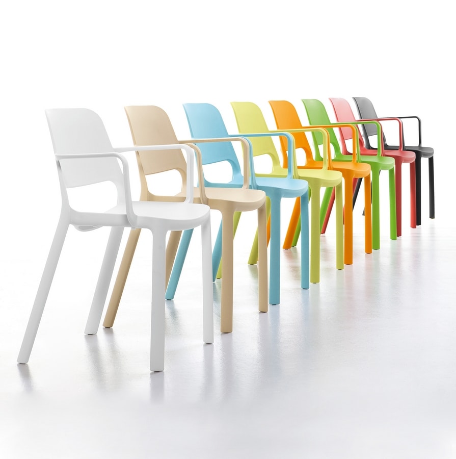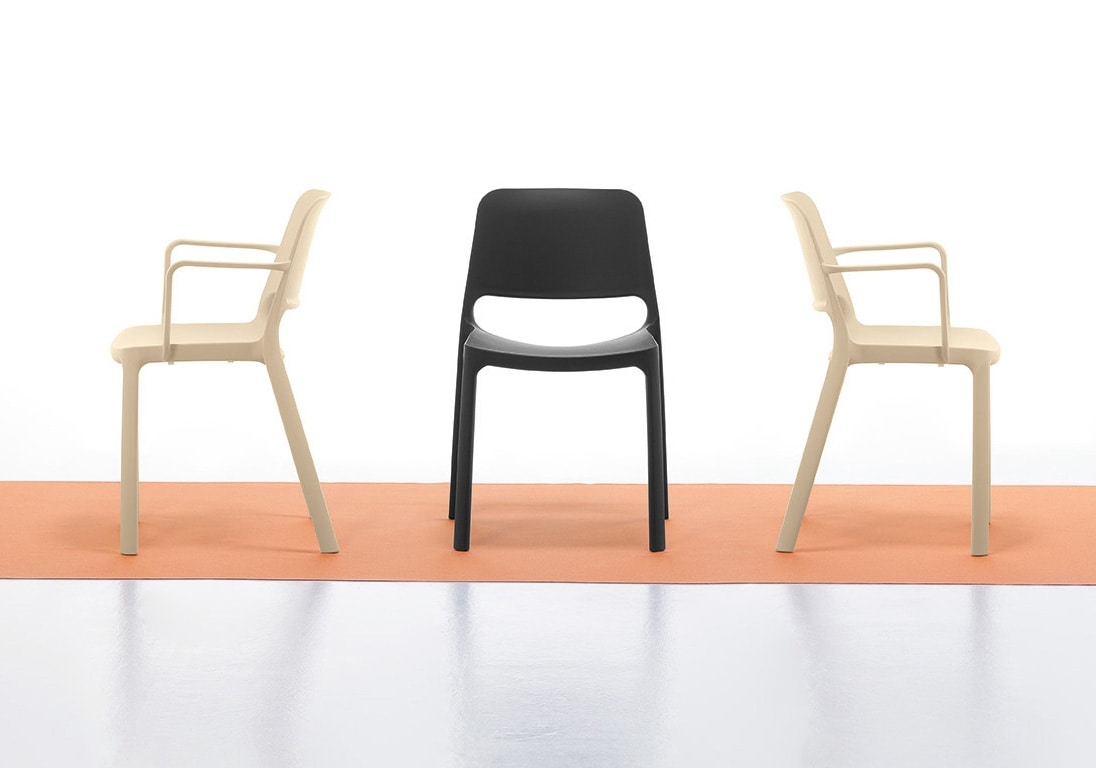Chaise, avec ou sans accoudoirs, entièrement réalisée en polypropylène pour les parties communes à l’intérieur ou à l’extérieur, pour les aires de pause ou les salles de réunion.