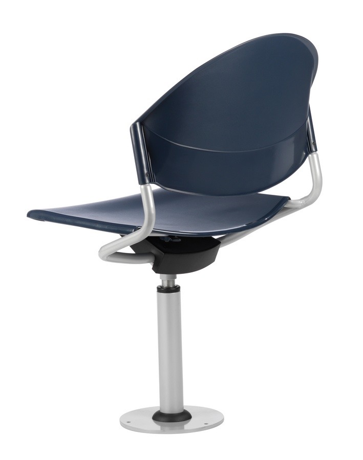 Chaise pivotante en métal, fixé au sol, avec assise et dossier en copolymère, disponible en différentes couleurs.