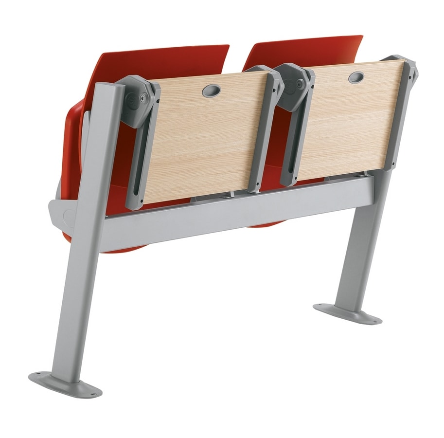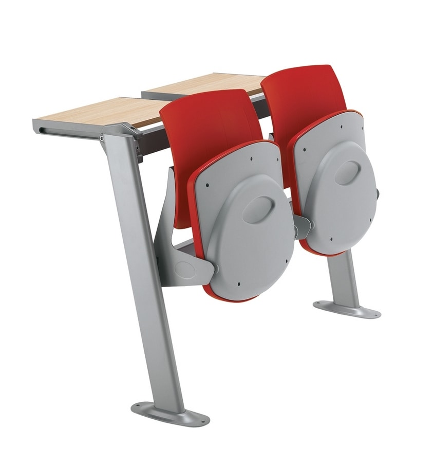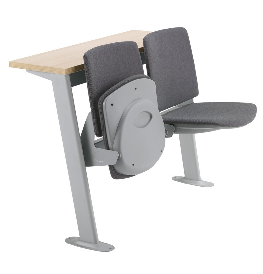 Banc d'étude pour les salles universitaires, les salles de formation, etc., caractérisé, pour les rangées intermédiaires uniquement, par le partage d'un seul montant du siège et du banc, tandis que pour la première et la dernière rangée, le banc et le banc sont indépendants. Le comptoir est disponible dans les versions fixes et inclinables (pour l'automne). L'assise est disponible en plusieurs versions: assise et dossier en PP en 6 couleurs de polypropylène, IMPP avec assise et dossier rembourrés en 6 couleurs de polypropylène, W avec assise et dossier en hêtre naturel. La série est accompagnée du "panneau avant de courtoisie" et du "réseau de détenteurs de livres". Finitions noires (N) et gris RAL 9007 (VA7).