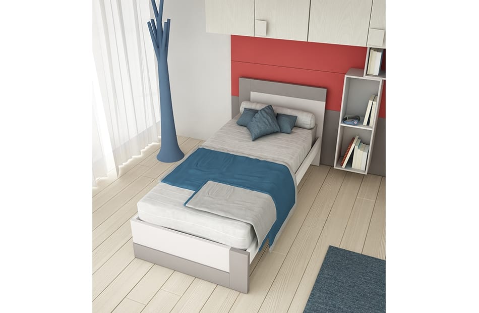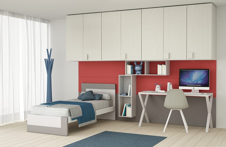 Chambre d'enfants avec lit Frame, armoire de pontage, bureau avec pieds Incrocio et étagères murales. Le contraste des couleurs entre Grigiochiaro et Rosso confère à la composition un aspect dynamique et frais.