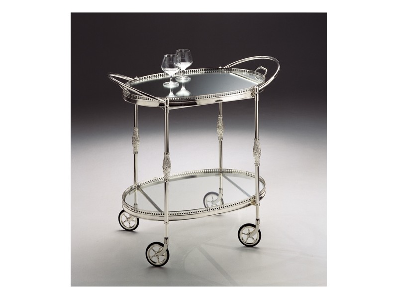 Table roulante en laiton argenté avec plateau amovible, verres transparents. Adapté aux environnements classiques.