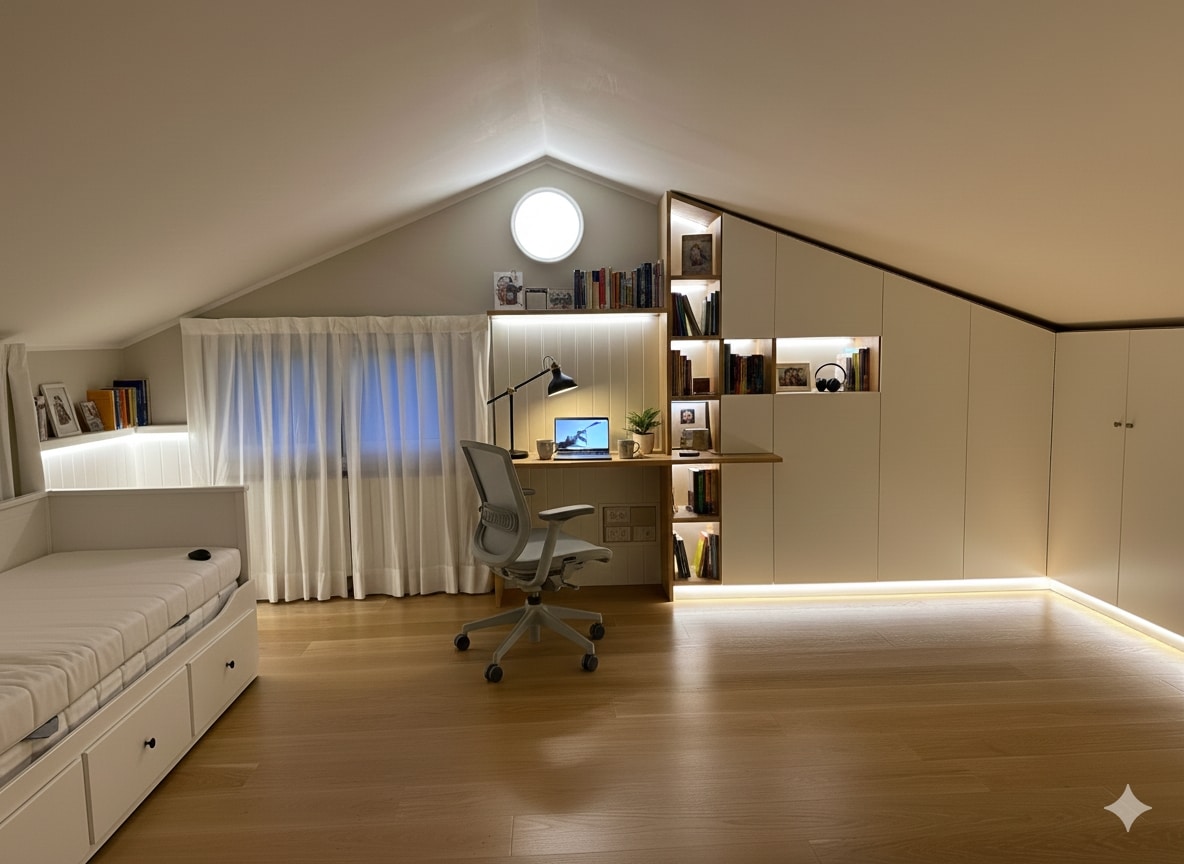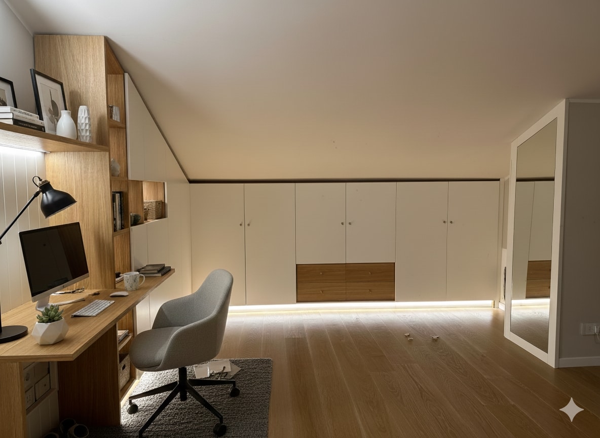 Mobilier sur mesure pour les combles, avec bibliothèque, bureau et penderie