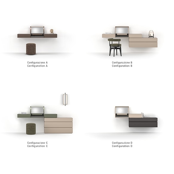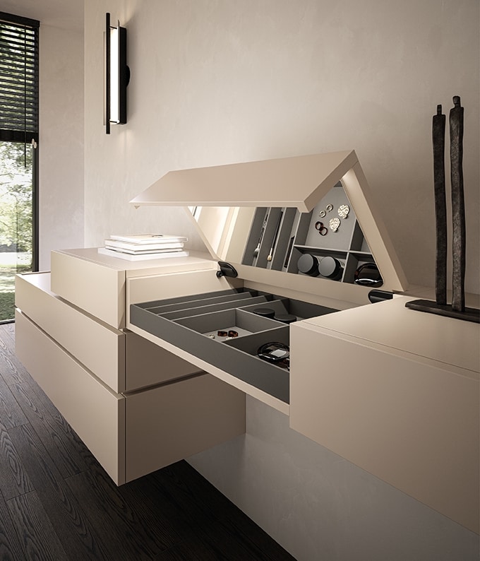 La collection système emblématique et intemporelle Gallia s'enrichit d'un nouvel élément, Beauty est un nouveau module supplémentaire pour ceux qui recherchent un élément de vanité à l'intérieur de leur chambre. La modularité libre laisse place à une flexibilité de conception maximale en fonction des différents besoins