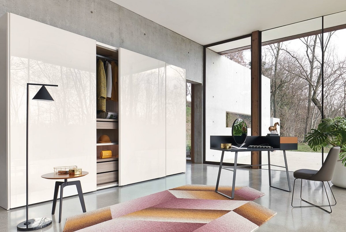 Détails du miroir réglable et des tiroirs coulissants, en finition laqué mat vison, également disponibles dans toutes les finitions laquées mat de la collection. La base en métal marron, comme le cadre du miroir, est également disponible en finition titane.