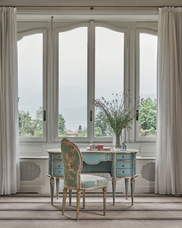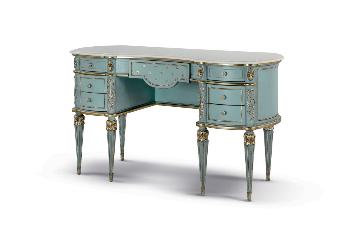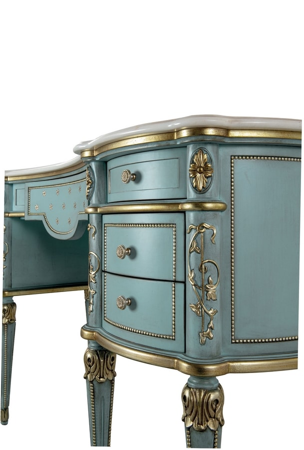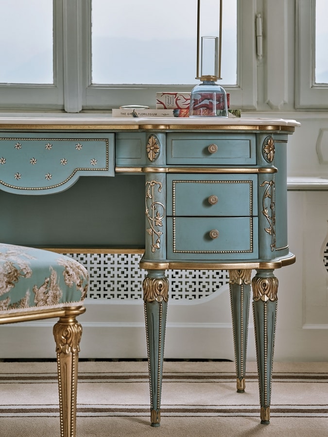 Coiffeuse avec éléments sculptés, plateau en marbre Rosa Portogallo Estremoz, finition laqué anis brossé avec détails en feuille d'or argenté et décorations peintes à la main.