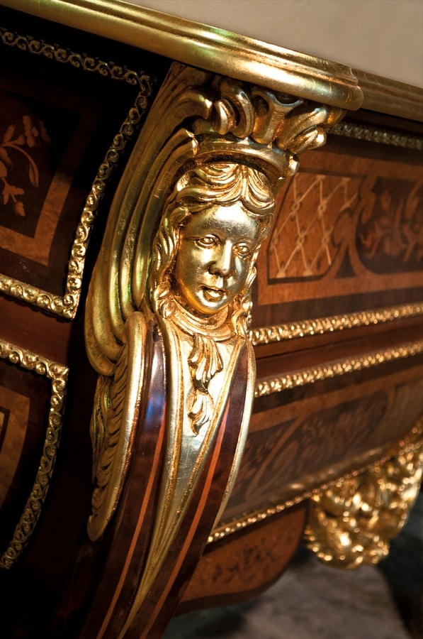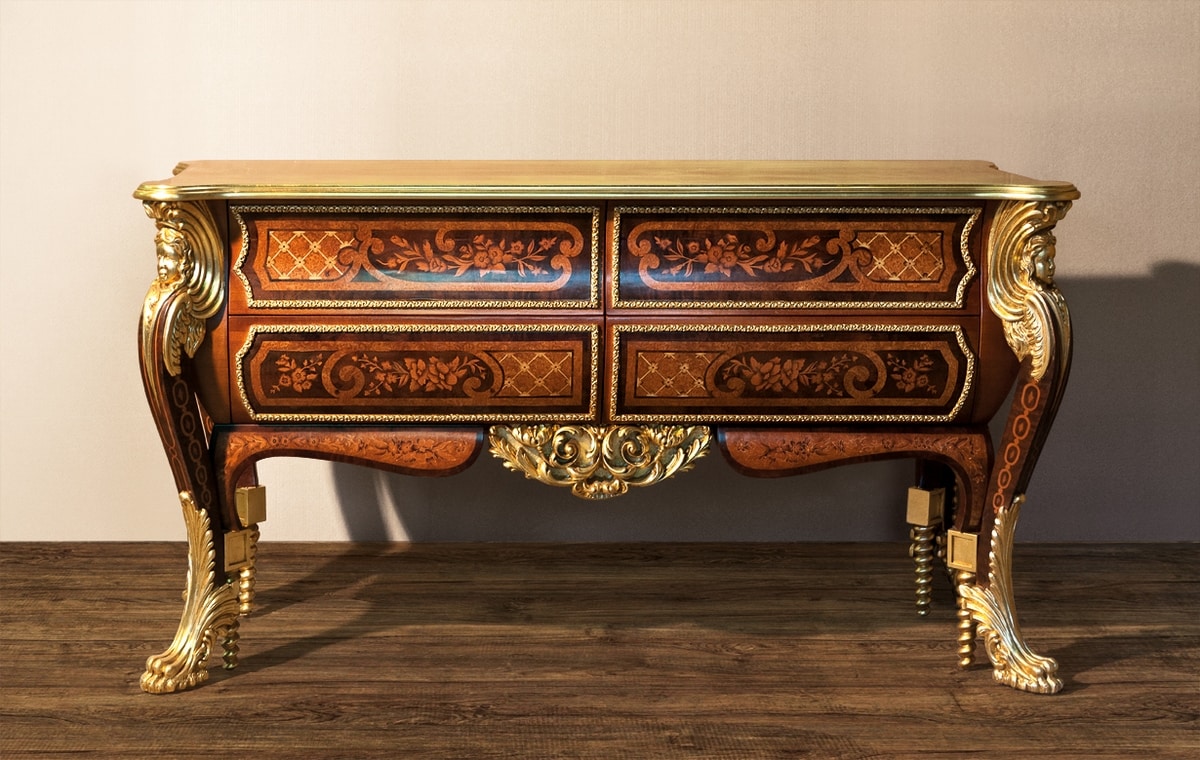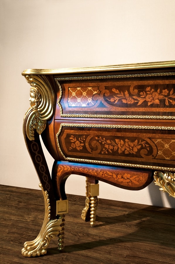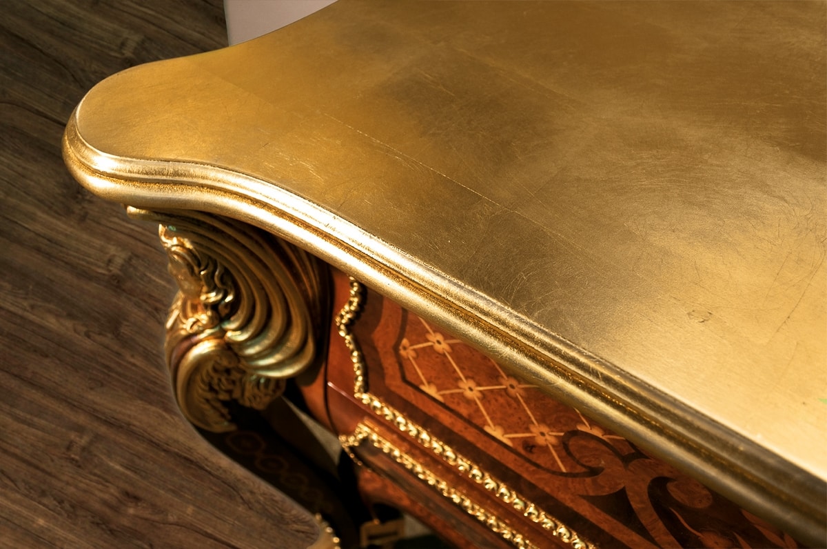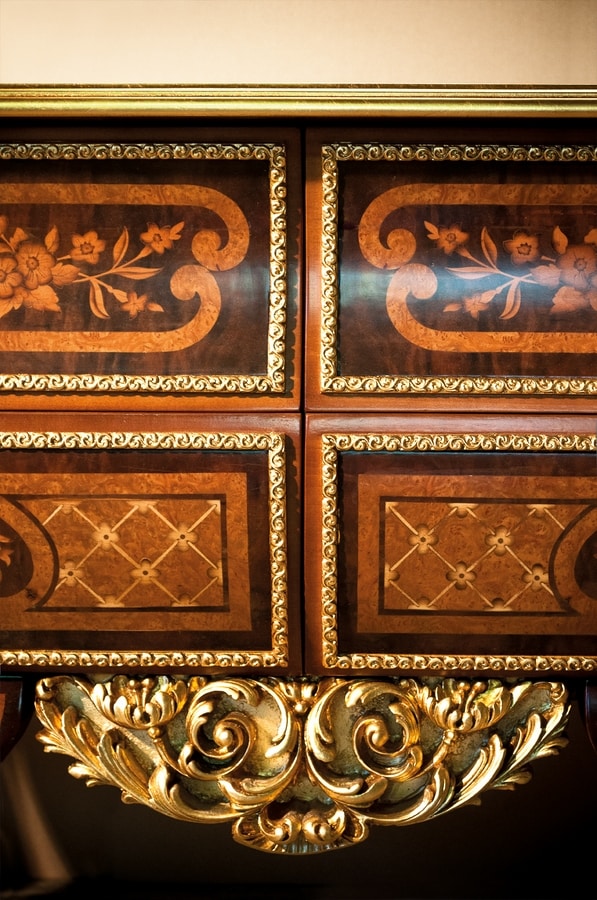 Commode à 4 tiroirs sculptée à la main, décorée de marqueterie et de feuilles d'or.