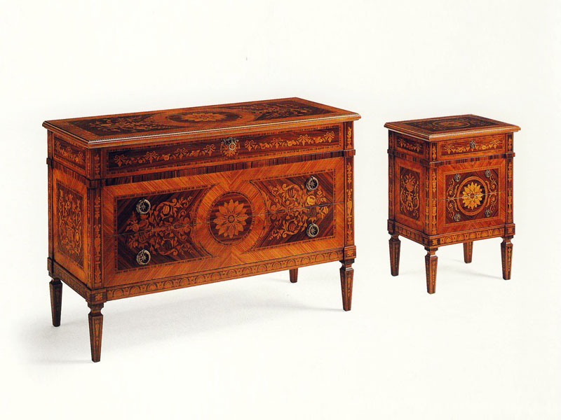La poitrine de tiroirs Maggiolini avec trois tiroirs incrustés de beaux bois. Commode avec cadre en bois de pin massif.