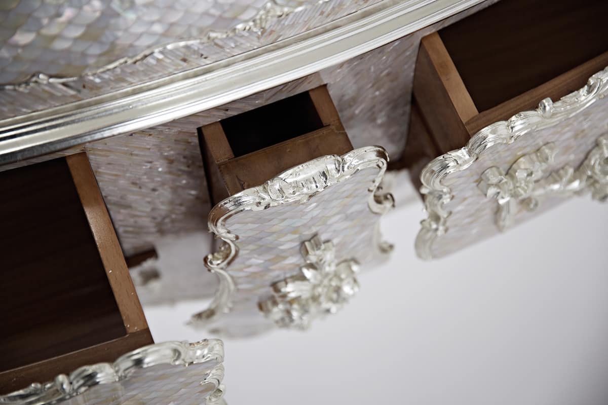 Les détails de l'or blanc décrivent ses somptueux contours, afin d'admirer à la fois ses volumes concaves et convexes, avec une foule de forces qui se rejoignent et s'échappent dans les précieux tiroirs et dans les lignes bizarres et capricieuses des pièces sculptées.